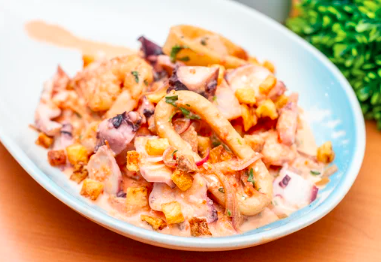 Leche de tigre, limón, salsa de tomate, mayonesa, cebolla, aceite de oliva.