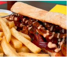 Pan árabe, trozos de chicharrón de chancho, aguacate, tomate, cebolla, cilantro, salsas peruanas, acompañado de papa francesa y bebida.