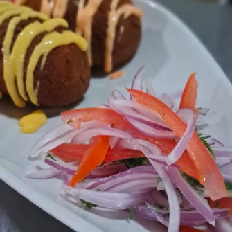 Salsa al ají amarillo, cebolla, maíz tierno, cilantro.