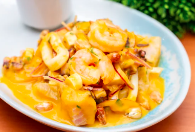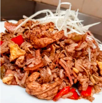 Deliciosos camarones salteados al wok, mezclados con el tradicional chaufa peruano.