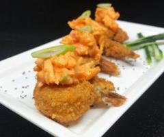 Deliciosos langostinos tempura x 4, con topping de dinamita de kanikama desmechada, masago, mayonesa japonesa, verdeo y siracha.