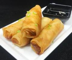 4 Increíbles lumpias fritas de vegetales marinados, con salsa de soja y ajonjolí.