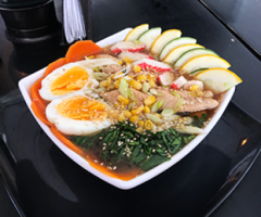 Exquisito ramen mixto de con costilla de cerdo marinado en finas hierbas, combinación de proteínas (huevo y Kanikama) y vegetales (acelga, espinaca, zanahoria y zucchini) sazonados en nuestra salsa shoyu y bañadas en un delicioso caldo japonés con aceite de ajonjolí y verdeo, semillas de ajonjolí.