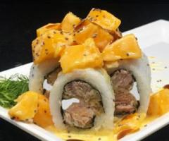 Nada más bakano que estos 10 bocados de uramaki de tuna tempura con queso crema y topping de trozos de mango bañados en salsa de la casa y semillas de chía, decorado con mayonesa y perejil.