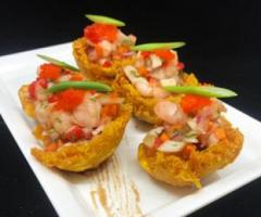 Delicioso salpicón de camarón cocinado en limón y verduras picadas, con topping de masago y verdeo, servido en 5 delicados canastos de plátano verde.