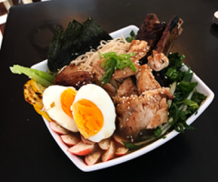 Delicioso ramen de cerdo a la plancha con una exquisita combinación de proteínas, huevo y naruto, vegetales, acelga, espinaca, zanahoria y succino, sazonados en nuestra salsa shoyu y bañadas en delicioso caldo japonés con aceite de ajonjolí.