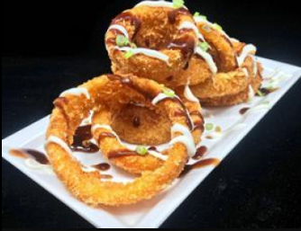 Crujientes aros de cebolla 8 unidades, preparados con nuestra receta especial de la casa, perfectamente sazonados y tempurados para lograr una textura dorada y ligera. Bañados en salsa teriyaki, un toque de mayonesa cremosa y decorados con cebollín fresco.