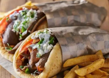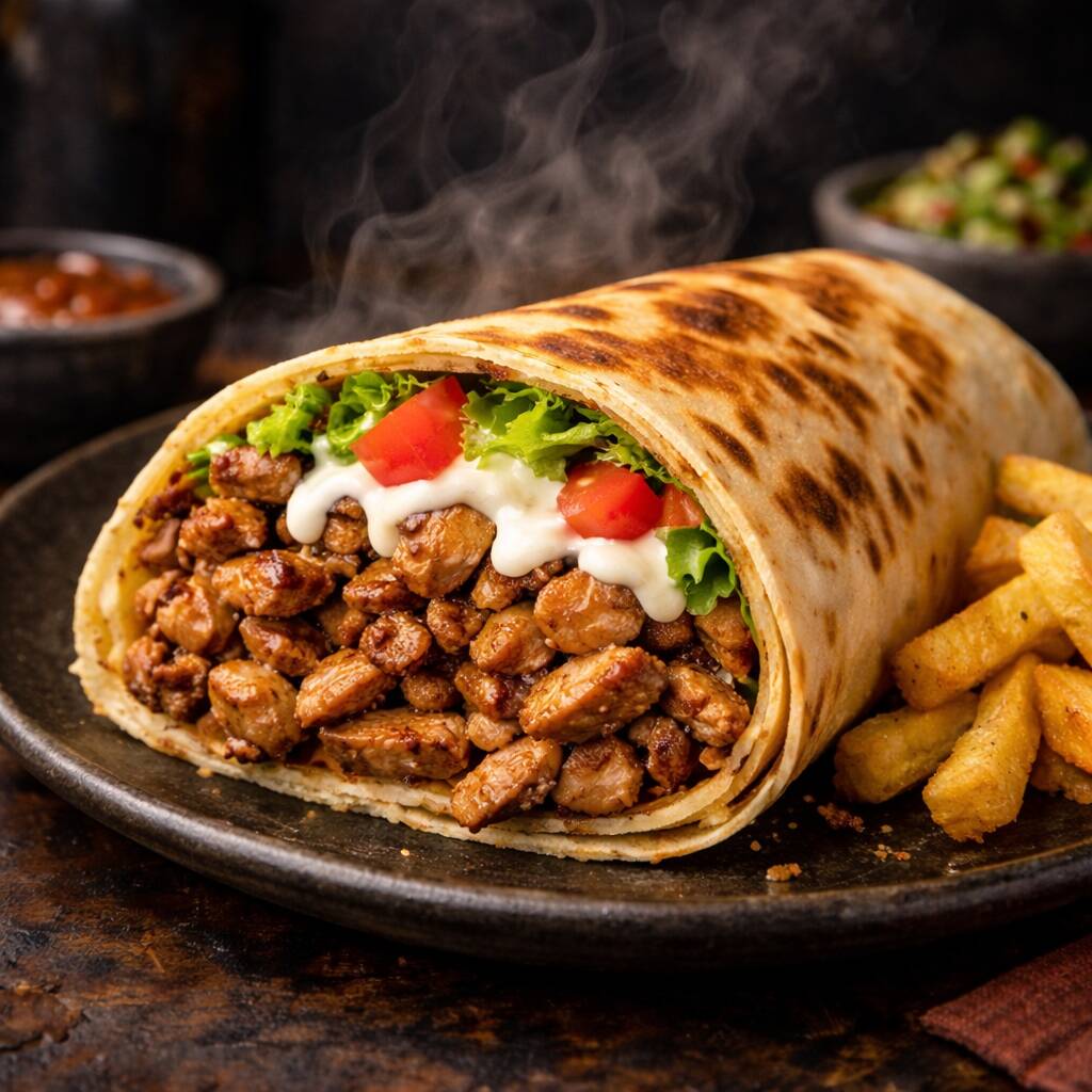 60 gr de pollo asado,60 gr de carne asada,lechuga tomate,maiz,jamon,queso,acompañado de salsa de ajo o salsa de pimenton a su eleccion envuelto en pan arabe y aconpañado de salsa de ajo