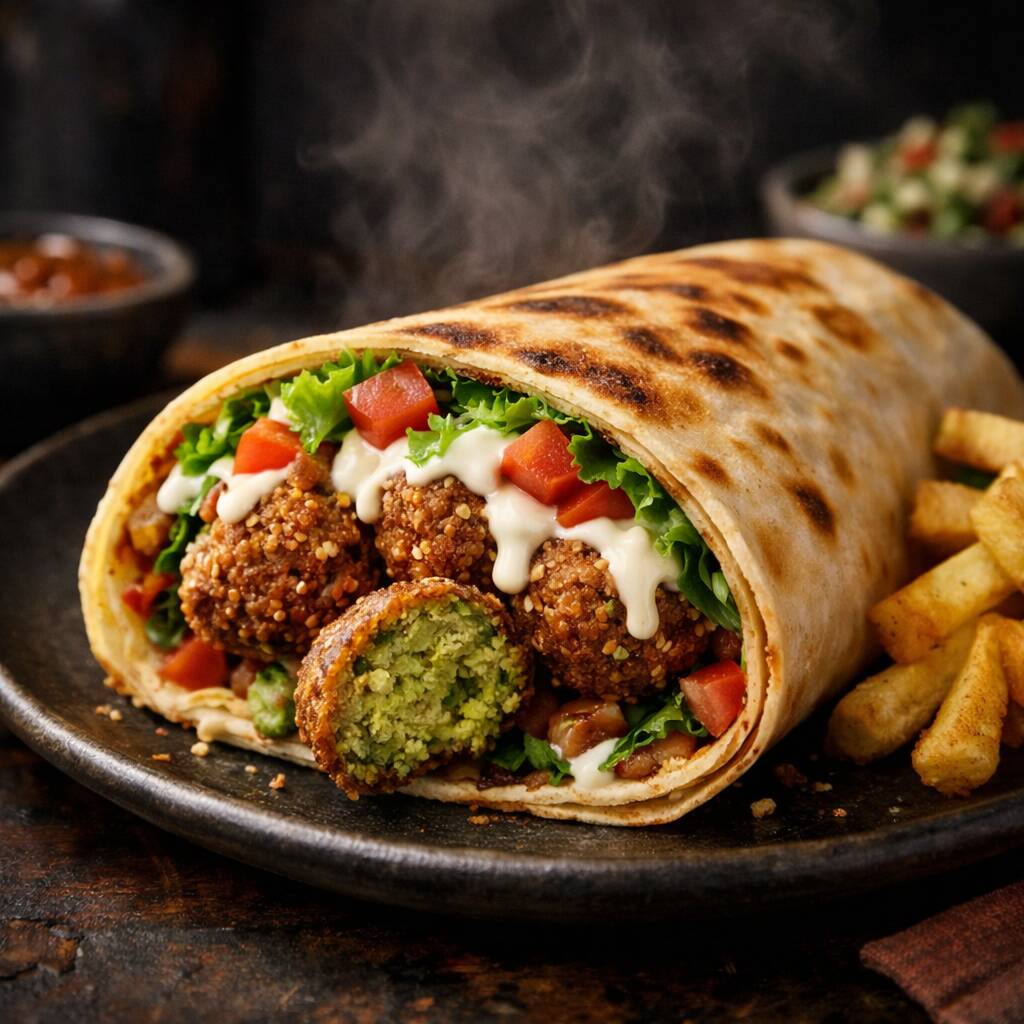4 Croquetas de garbanzo,queso,jamon,maiz,tomate aconpañado con salsa de ajo o salsa de pimenton a su eleccion envuelto en pan arabe y acompañado con salsa de ajo