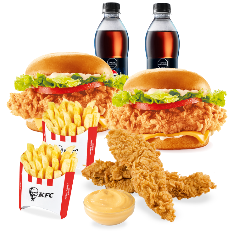 2 Sándwiches BBQ Crunch (c/u 1 Filete de pollo apanado) + 1 Pop Corn Pequeño (Trocitos de pechuga de pollo apanados) + 2 Papa Pequeña + 2 Gaseosas PET 400ml