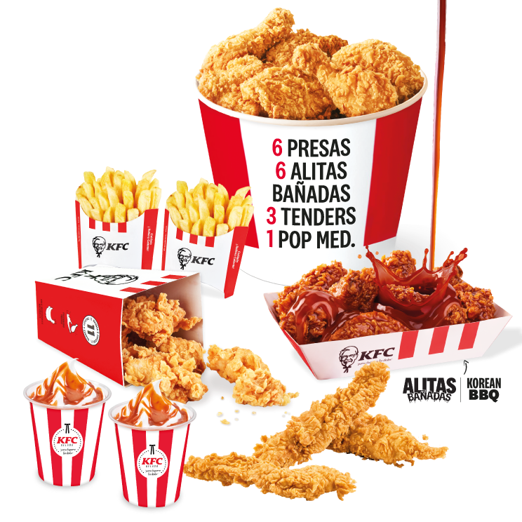 6 Presas + 6 Alitas en salsa Korean BBQ(Las alitas picantes hot wings equivalen a un trozo de ala) +Pop Med+ 6 Nuggets + 2 Papas Peq + 2 Sundae Areq