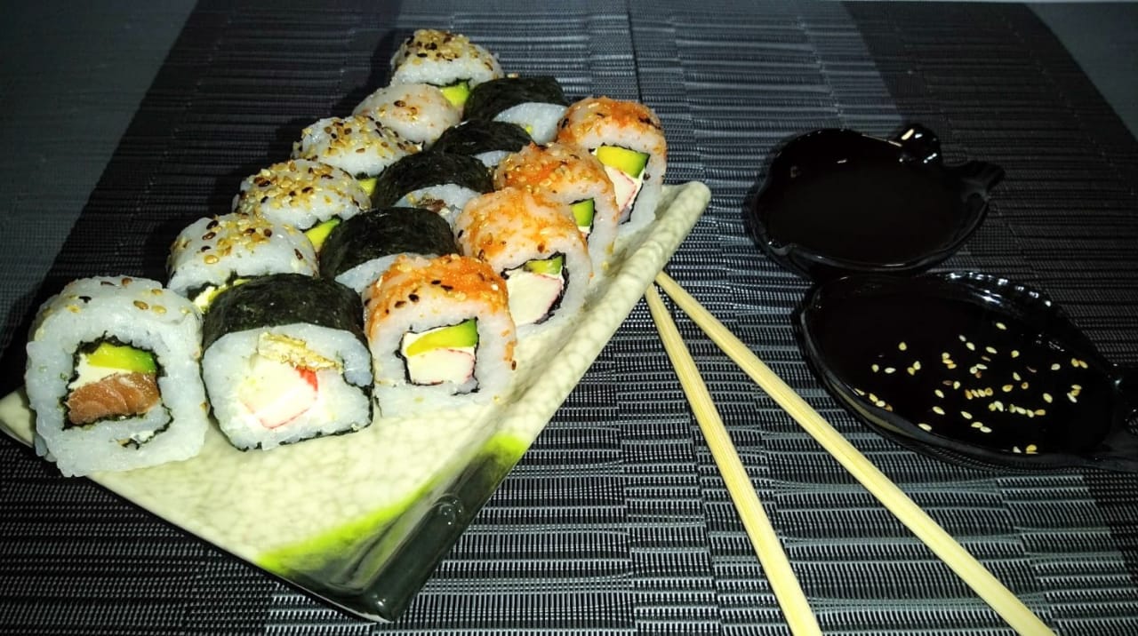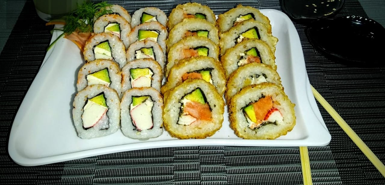 2 rolls fríos + 2 rolls apanados y toping de pasta de palmito de cangrejo + bebida de 1 litro.