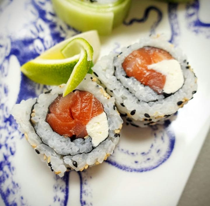 Salmón, queso crema y ajonjolí.