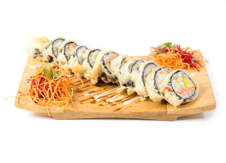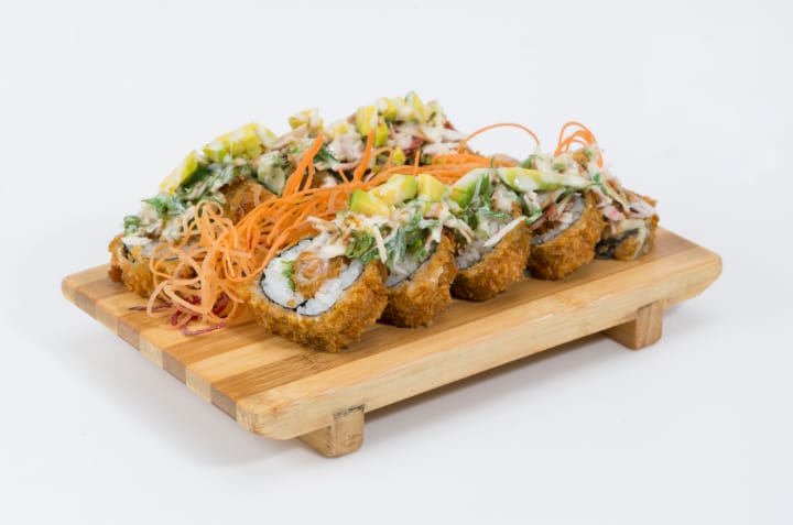 Palmito, aguacate, queso crema, cubierto de salmón apanado.
