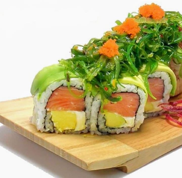 Salmón, aguacate, queso crema, cubierto de aguacate y wakame.