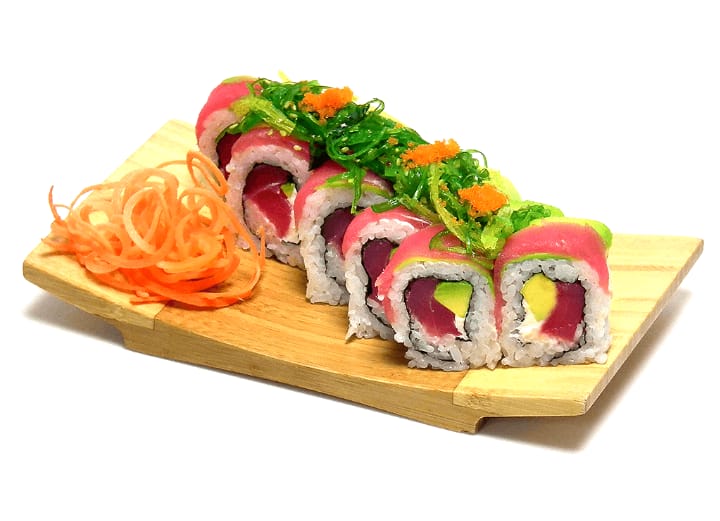 Atún, aguacate, queso crema, cubierto de atún, aguacate y wakame.