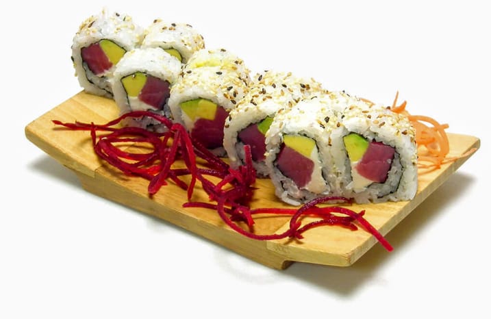 Atún, queso crema, aguacate y ajonjolí.