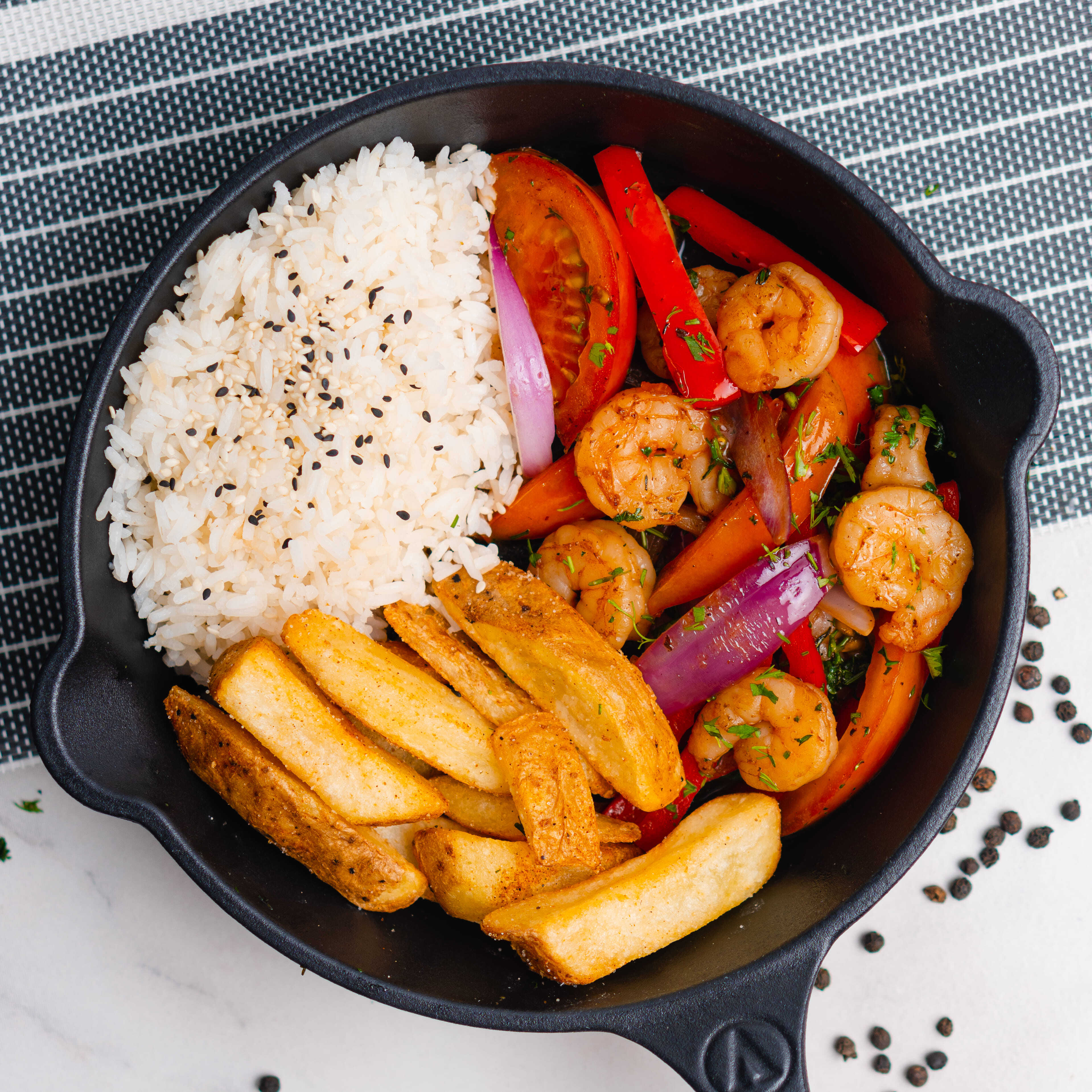 Camarones tigre al vino salteados al wok en salsa peruana con vegetales frescos (tomate, pimenton, cebolla morada y cilantro), acompañado de arroz blanco y papas de la casa.