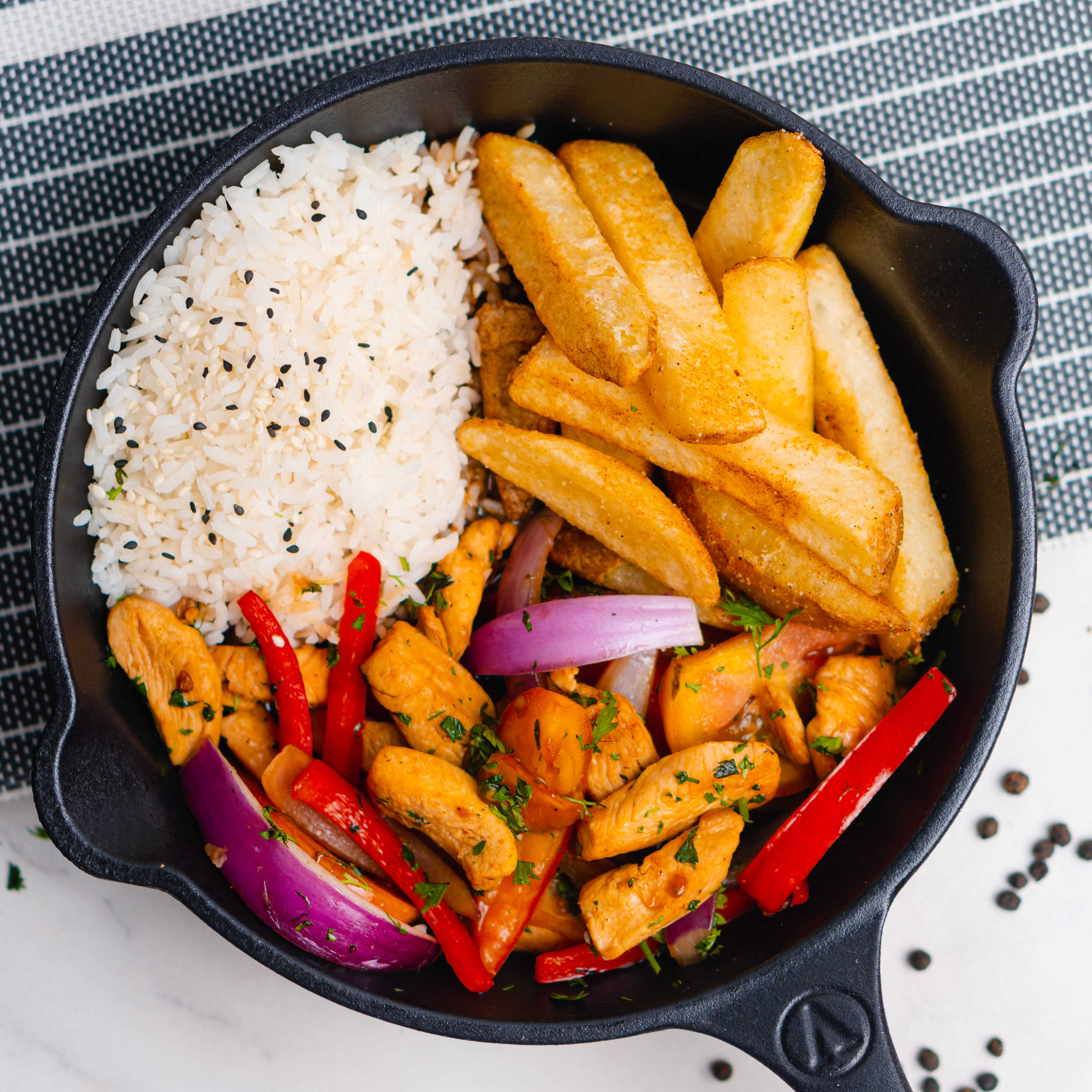 Trozos de pechuga de pollo salteados al wok en salsa peruana con vegetales frescos (tomate, pimenton, cebolla moraday cilantro) decorado con mix de ajonjoli y cebollín. acompañado de arroz blanco y papas de la casa.