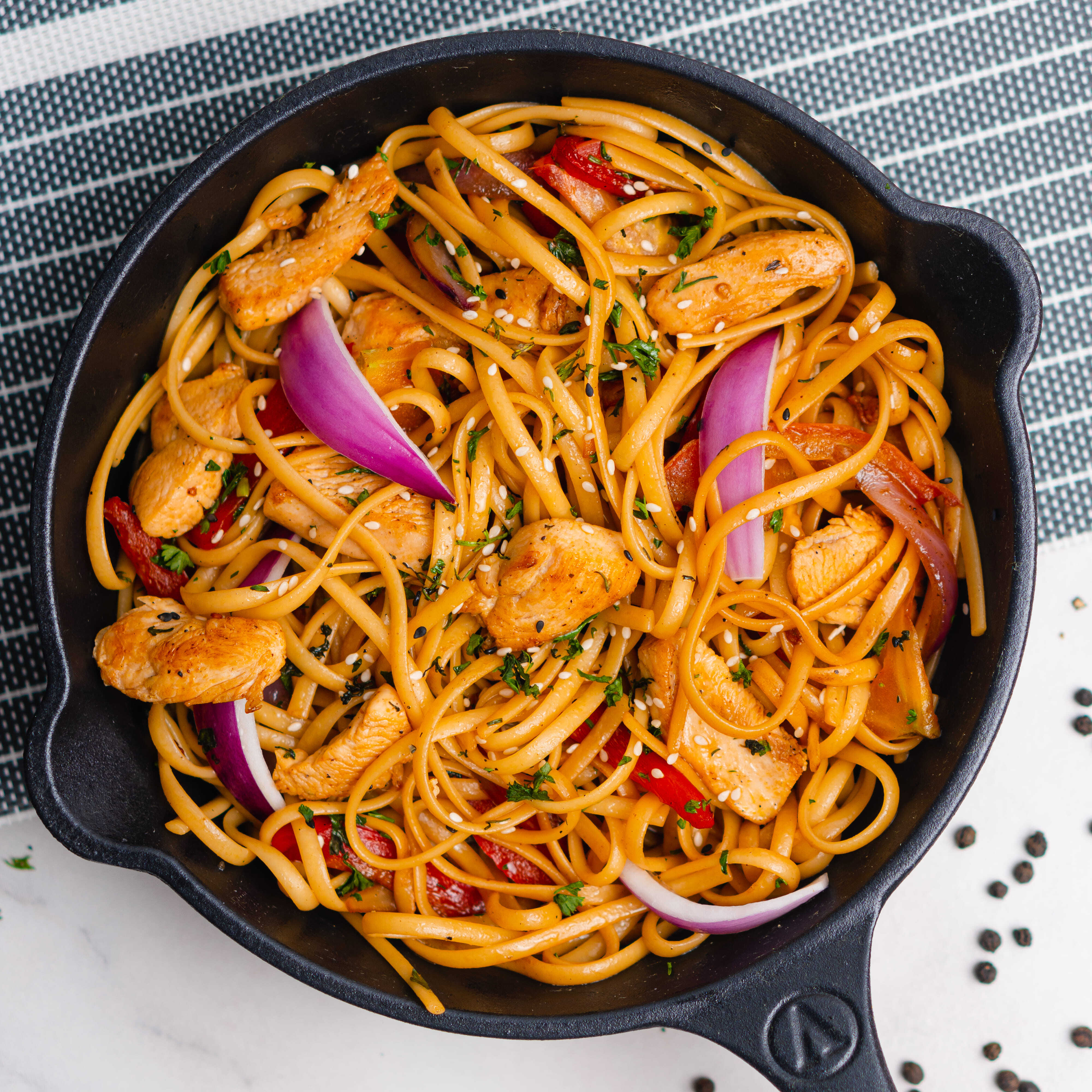 Tallarines con trozos de pechuga de pollo salteados al wok en salsa peruana y vegetales frescos (tomate, pimenton, cebolla morada y cilantro).
