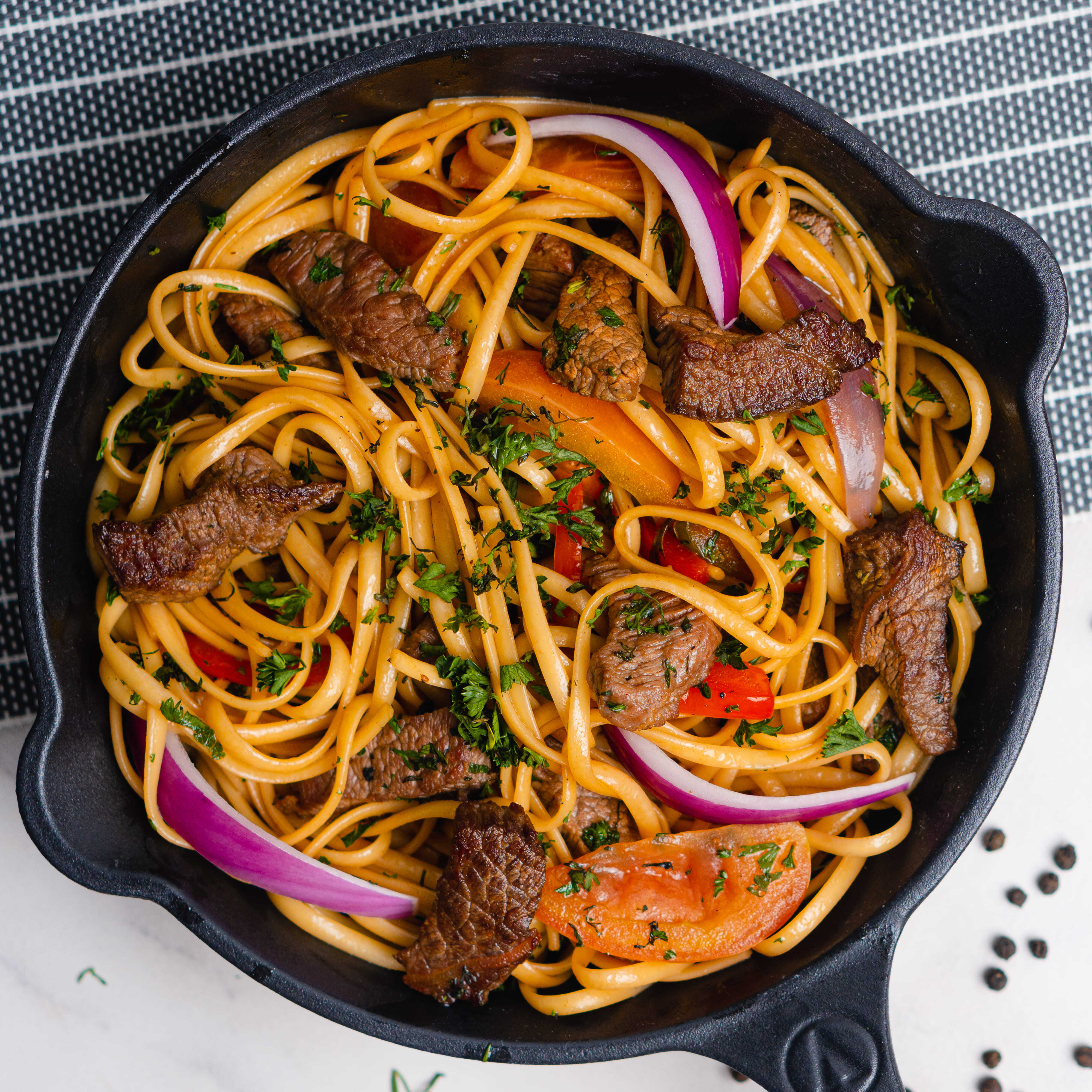 Tallarines con trozos de lomo de res salteados al wok en salsa peruana y vegetales frescos (tomate, pimenton, cebolla morada y cilantro).