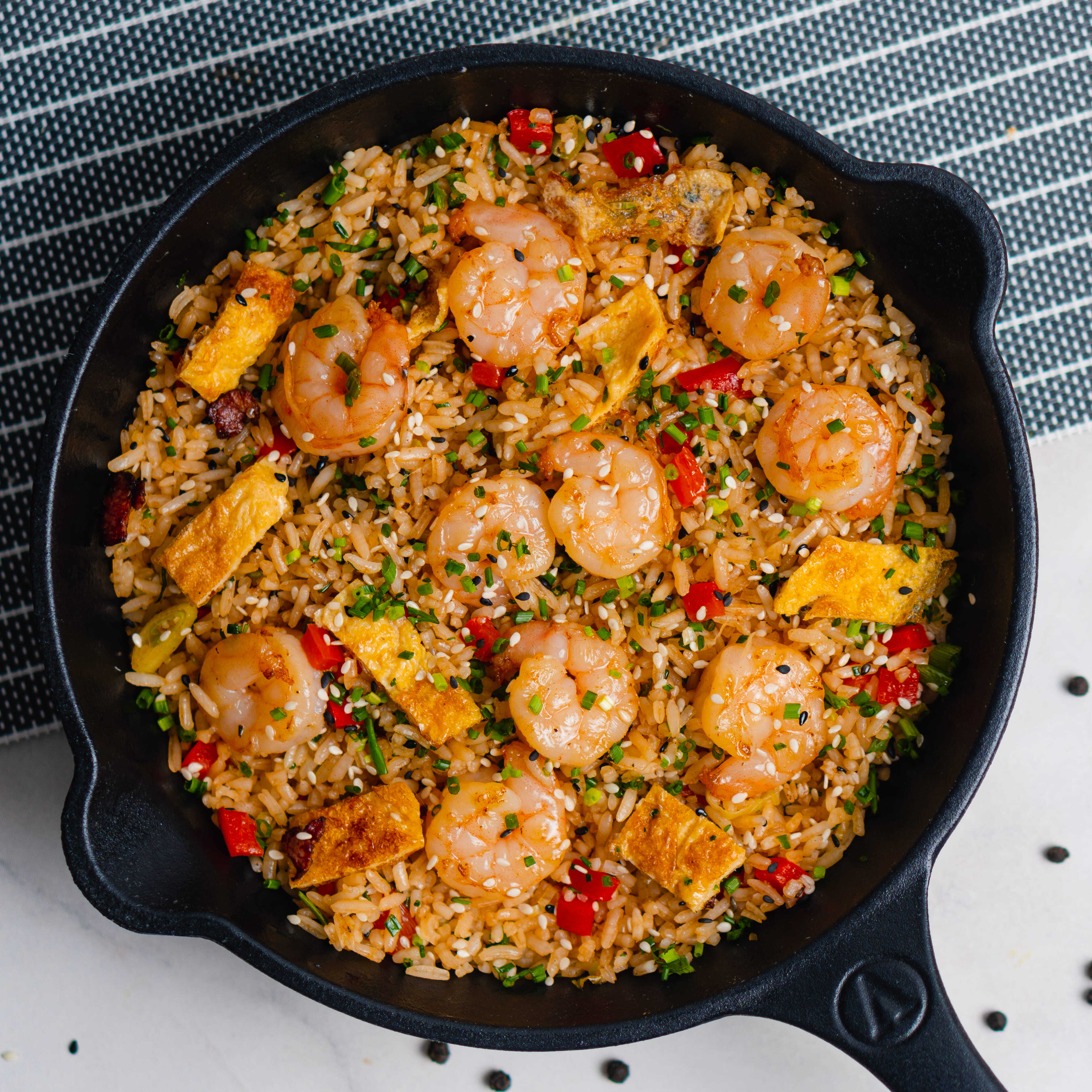 Arroz sofrito al wok con camarones tigre al vino salteados en salsa peruana, con tortilla de huevo y vegetales frescos (pimentón, cebolla larga, ajo, jengibre y cebollín).