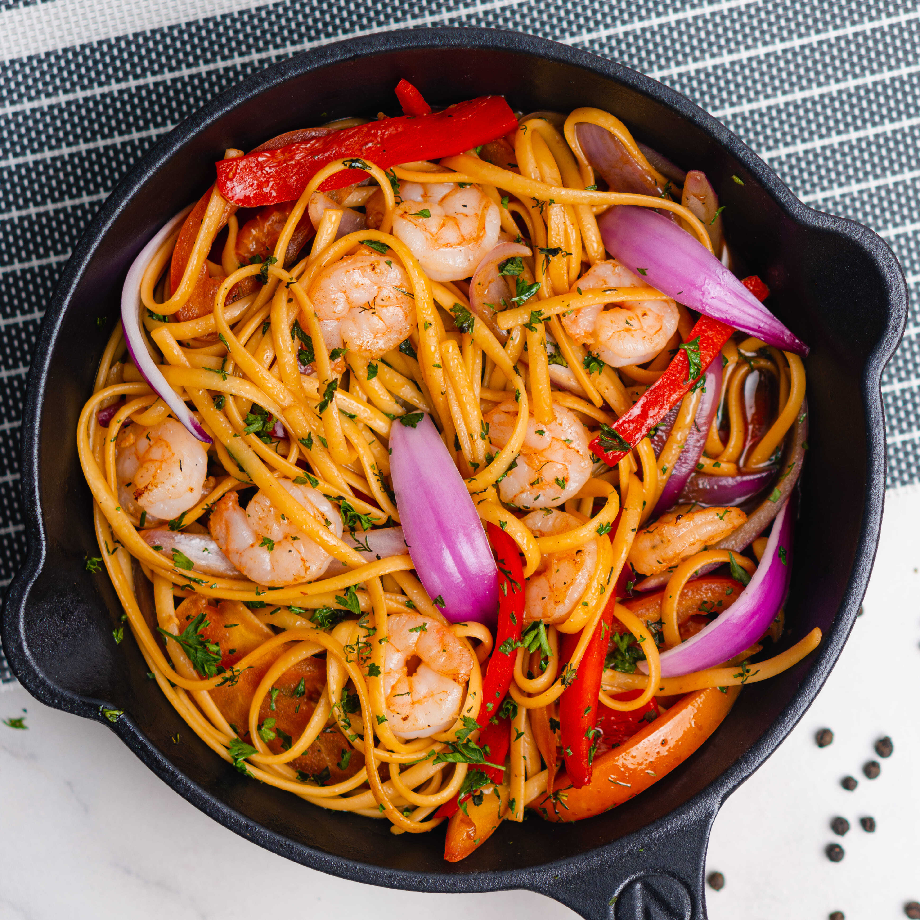 Tallarines con camarones tigre al vino salteados al wok en salsa peruana y vegetales frescos (tomate, pimenton, cebolla morada y cilantro).