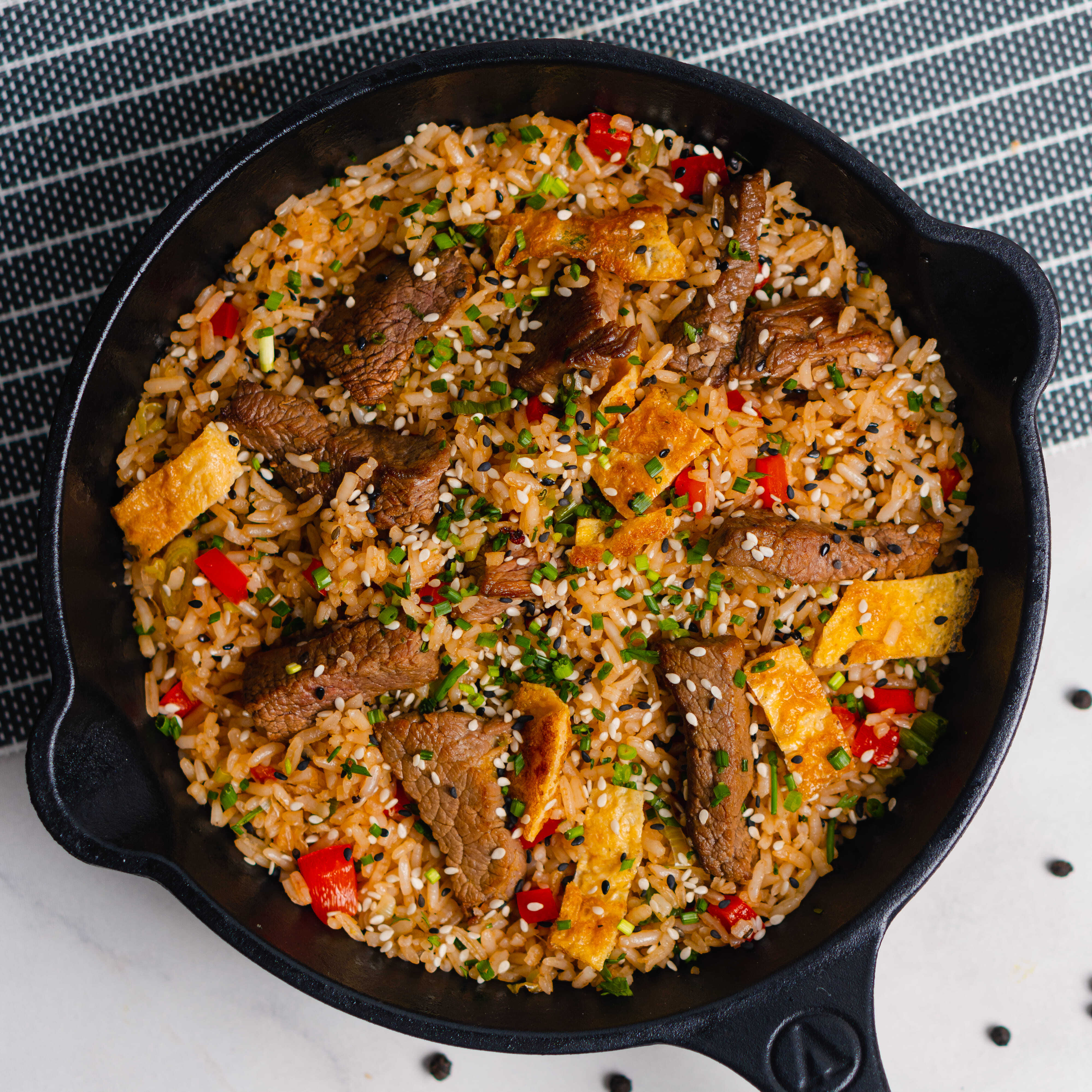Arroz sofrito al wok con trozos de lomo de res salteado en salsa peruana con tortilla de huevo y vegetales frescos (pimentón, cebolla larga, ajo, jengibre y cebollín).
