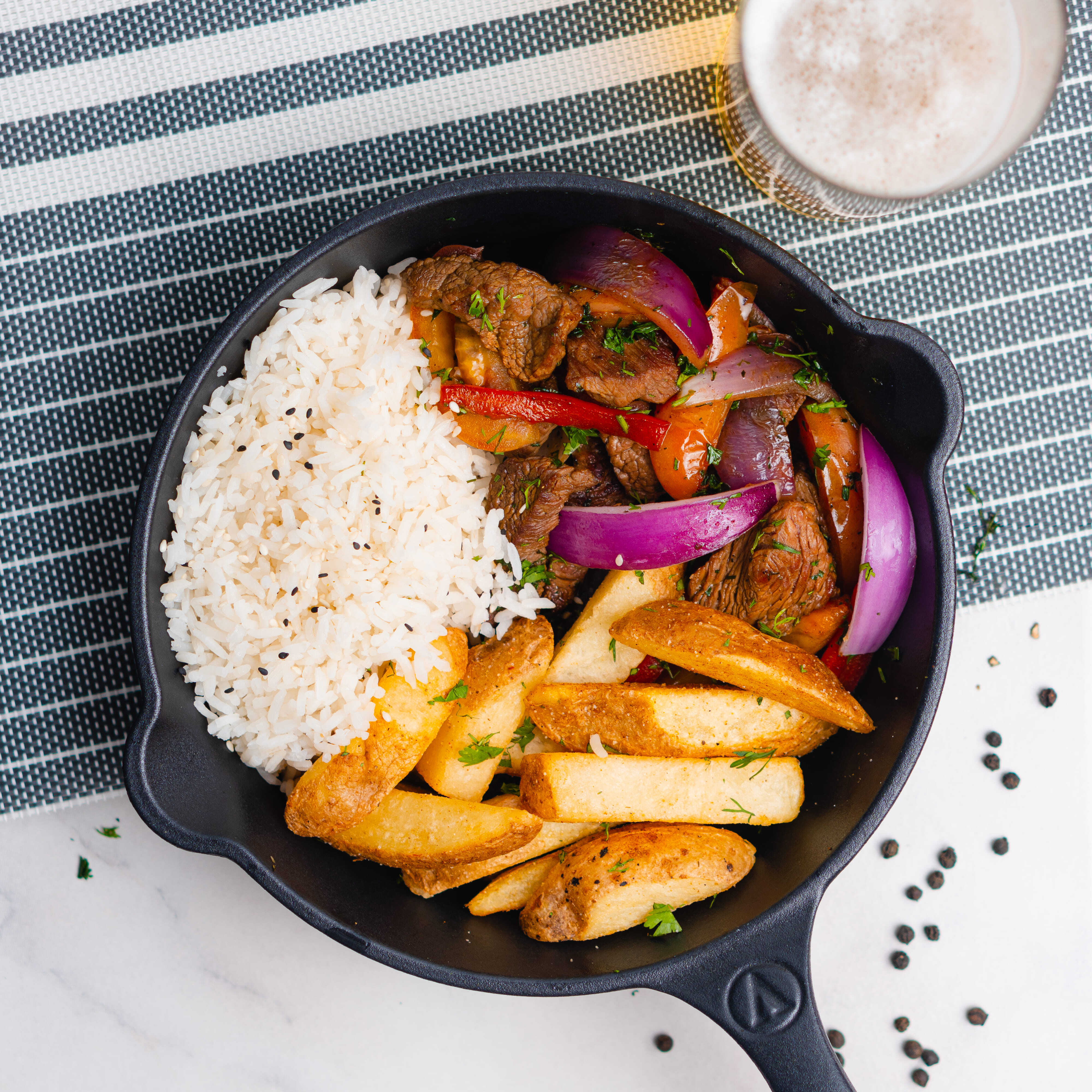 Trozos de lomo de res salteados al wok en salsa peruana con vegetales frescos (tomate, pimenton, cebolla morada y cilantro) decorado con mix de ajonjoli y cebollín. acompañado de arroz blanco y papas de la casa.