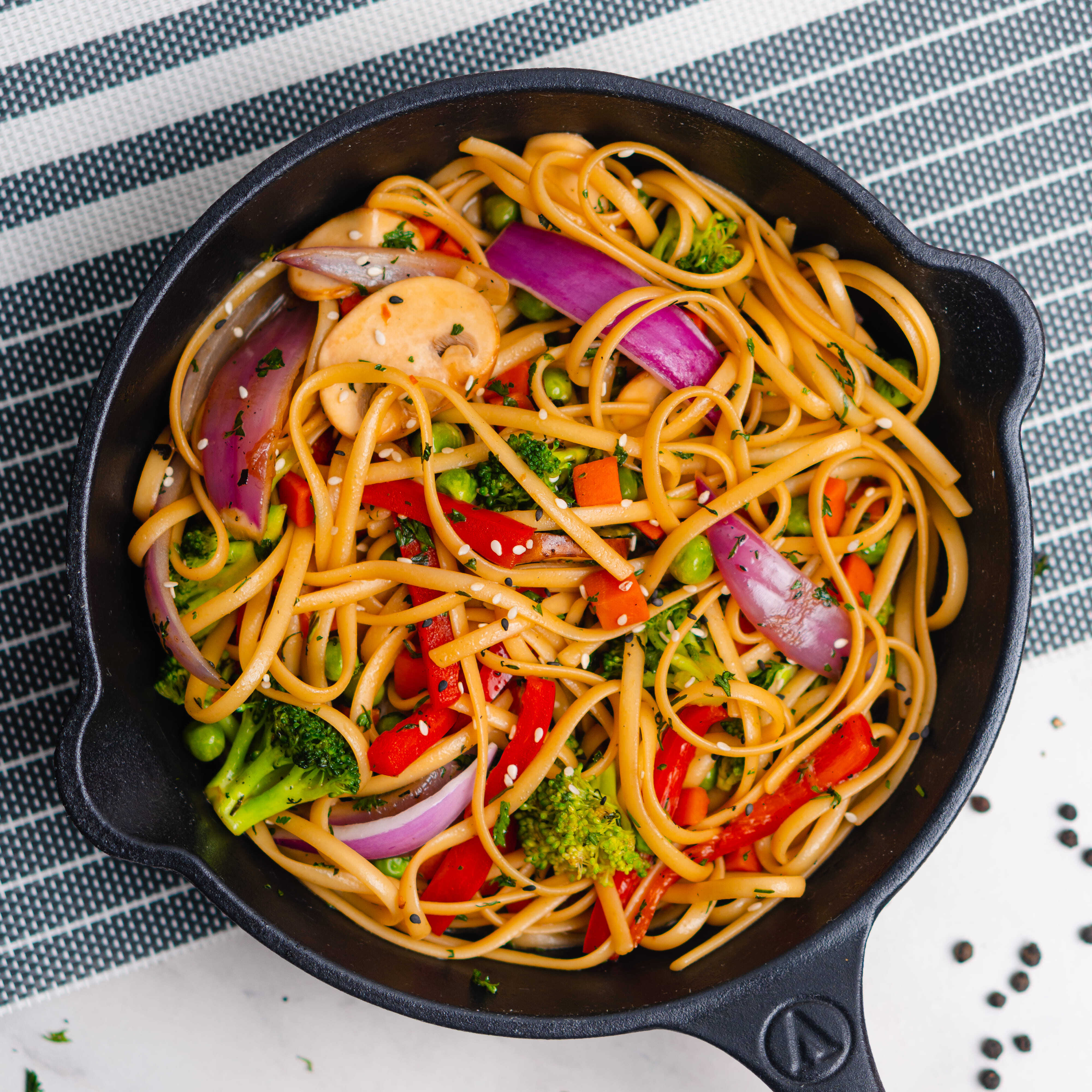 Tallarines salteados al wok en salsa peruana y vegetales frescos (tomate, pimentón, cebolla morada, champiñones, brócoli, zanahoria, arveja y cilantro).