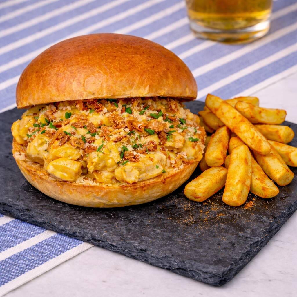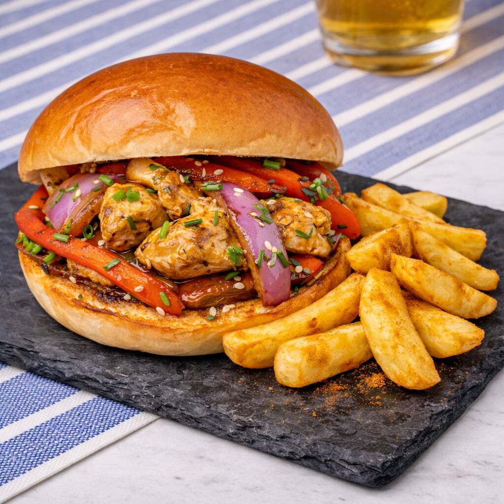 Sanguche en pan ciabatta con trozos de pechuga de pollo y cebolla grille salteados al wok en cremosa salsa a la huancaina (PICANTE) con queso parmesano y cebolla crispy. acompañado de papas fritas rústicas de la casa.