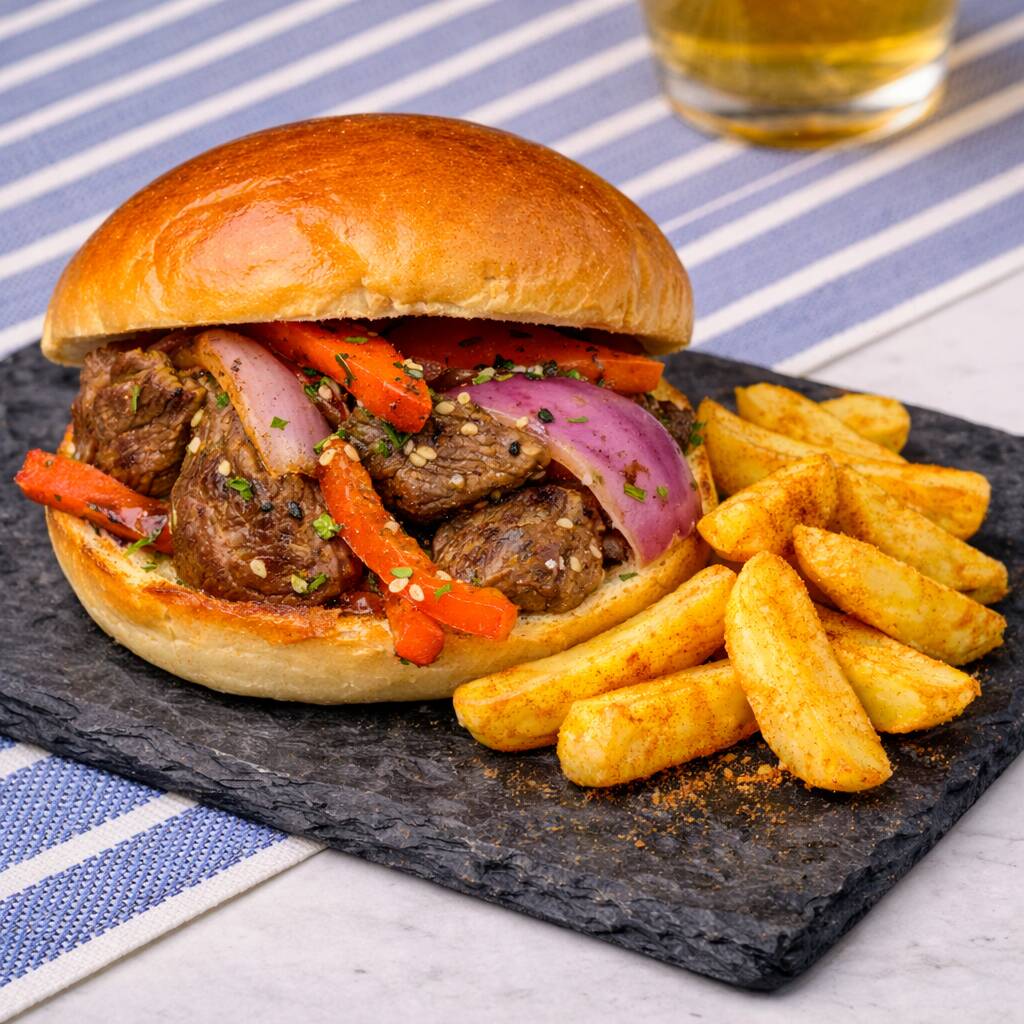 Sanguche en pan brioche de papa con lomo de res salteado al wok en salsa peruana y vegetales frescos (lechuga, tomate, pimentón, cebolla morada y cilantro)