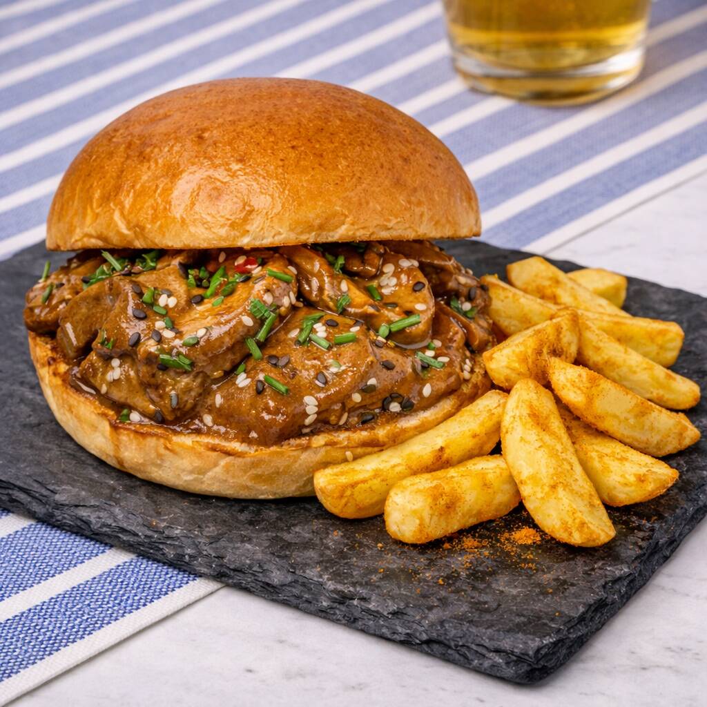 Sanguche de lomo en deliciosa salsa cremosa peruana, con champiñones, cebolla grille y cebollitas crispy.