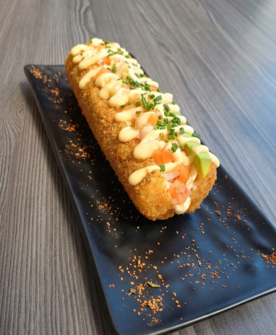 El dúo perfecto. Un crujiente hot dog de sushi relleno de nuestra cremosa ensalada de palmito de cangrejo y la suavidad del aguacate con queso crema. Bañado con un fresco mix de salmón, camarón tempura, salsa fuji y teriyaki. ¡Una experiencia irresistible!