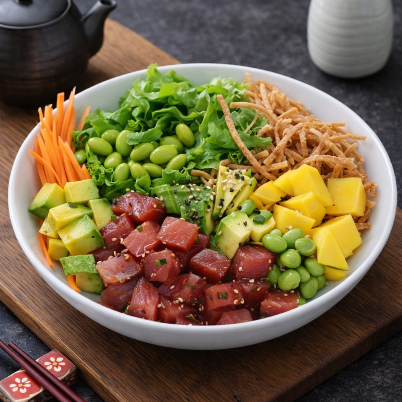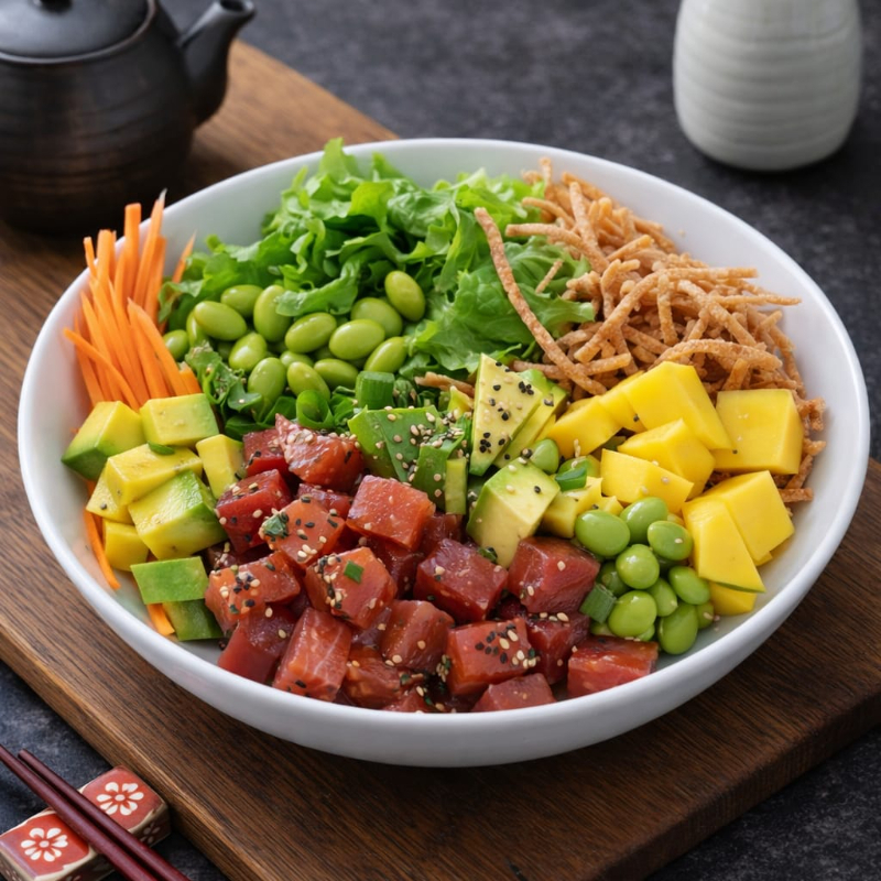 Arroz de sushi, piel de gyoza crocante, zanahoria, aguacate, edamame, mango, atún.