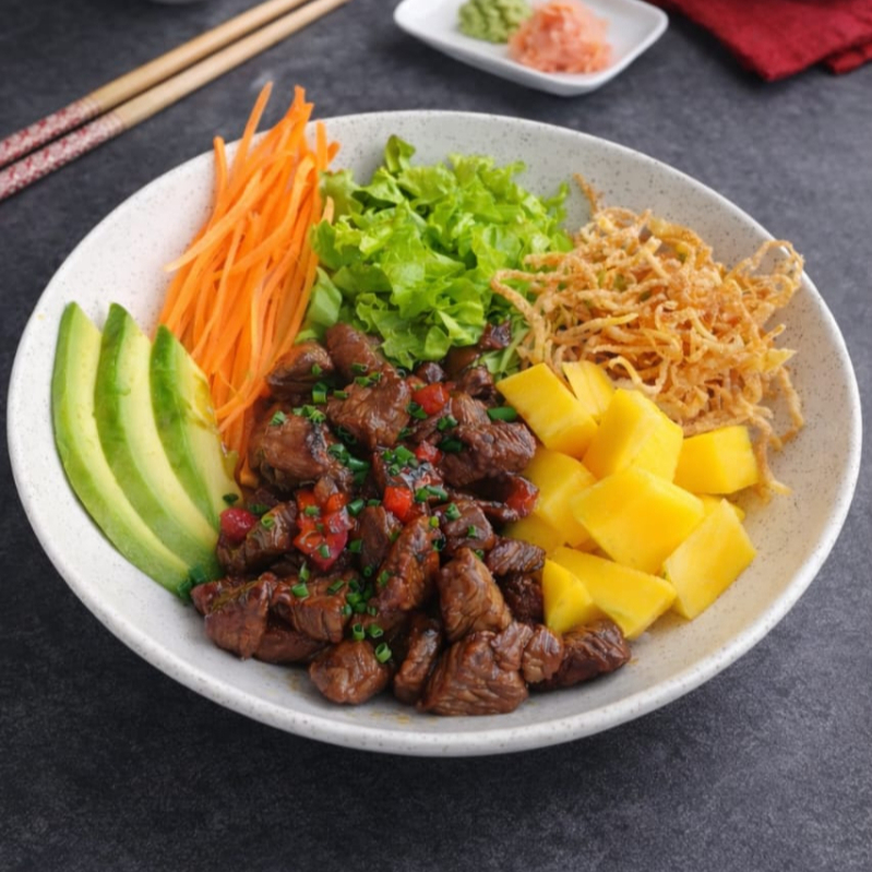 Arros de sushi, lechuga, zanahoria, piel de gyoza crocante, mango, aguacate, 160 gr. lomo fino de res salteado al wok