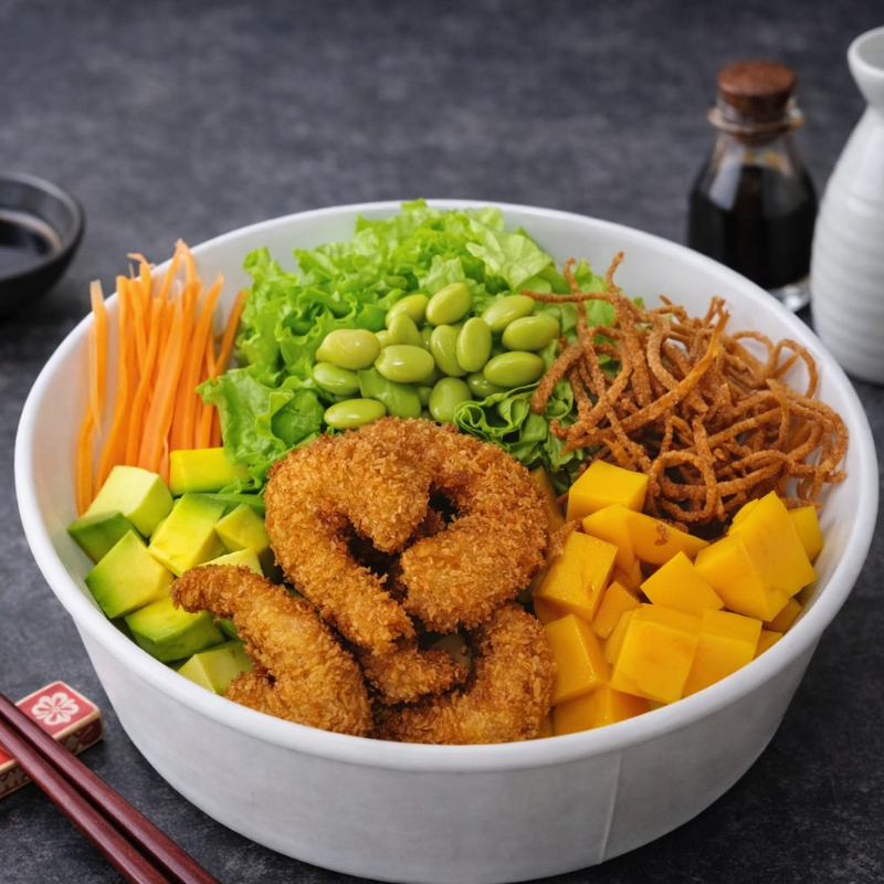 rroz de sushi, camaron, aguacate, mango, zanahoria, edamame y piel de gyoza crocante.