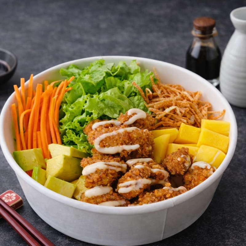 Arroz de sushi, piel de gyoza crocante, zanahoria, aguacatel, edamame, mango, salmón fresco.