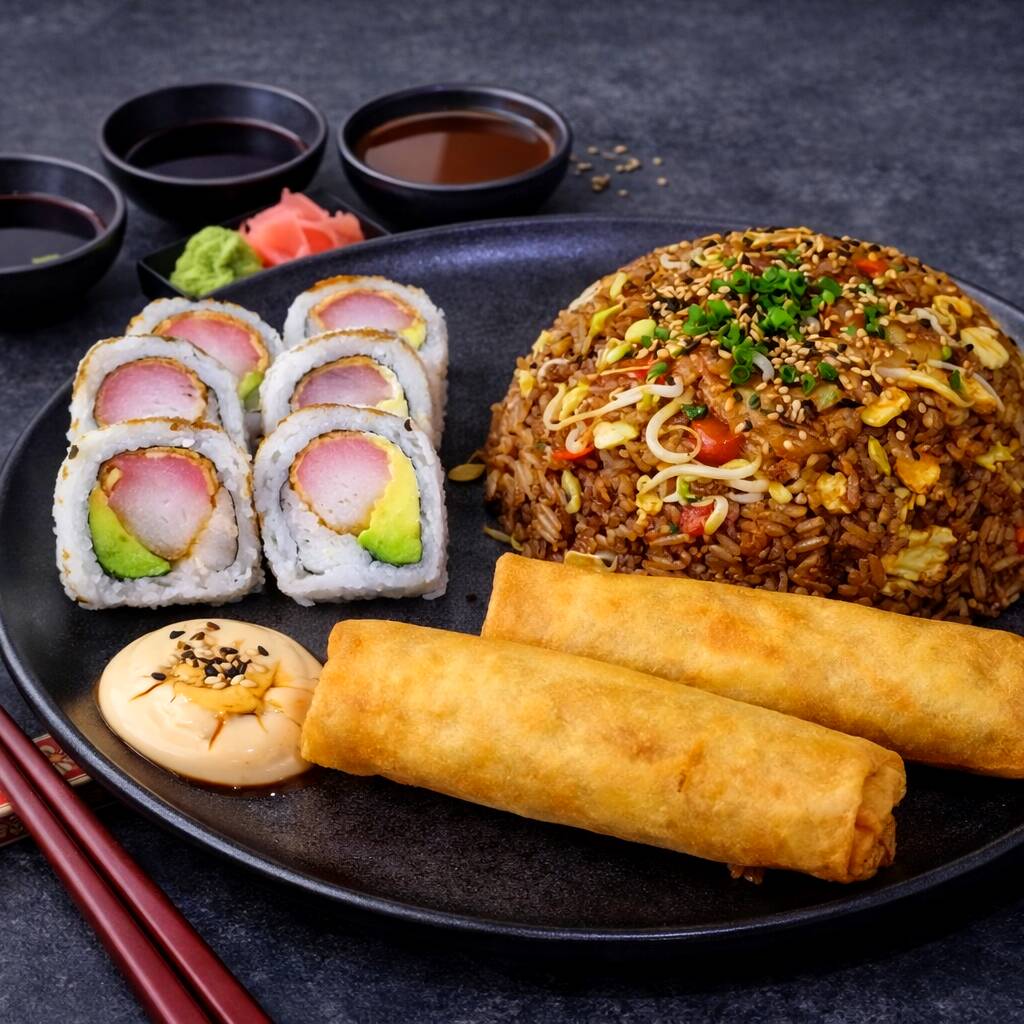 arroz de camarón salteado al wok, 6 piezas de Kioto roll y 2 spring rolls. Incluye salsa y acompañamientos.