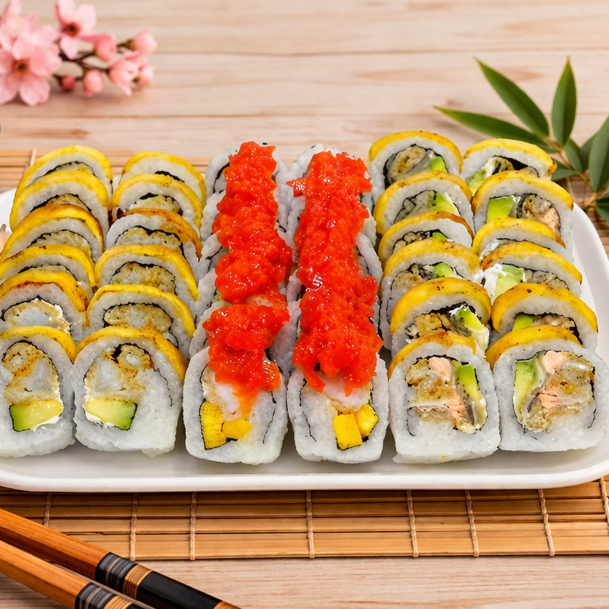 36 Piezas de sushi, Elige 3 sabores favoritos ( incluye soya y teriyaki, palitos, servilleta )