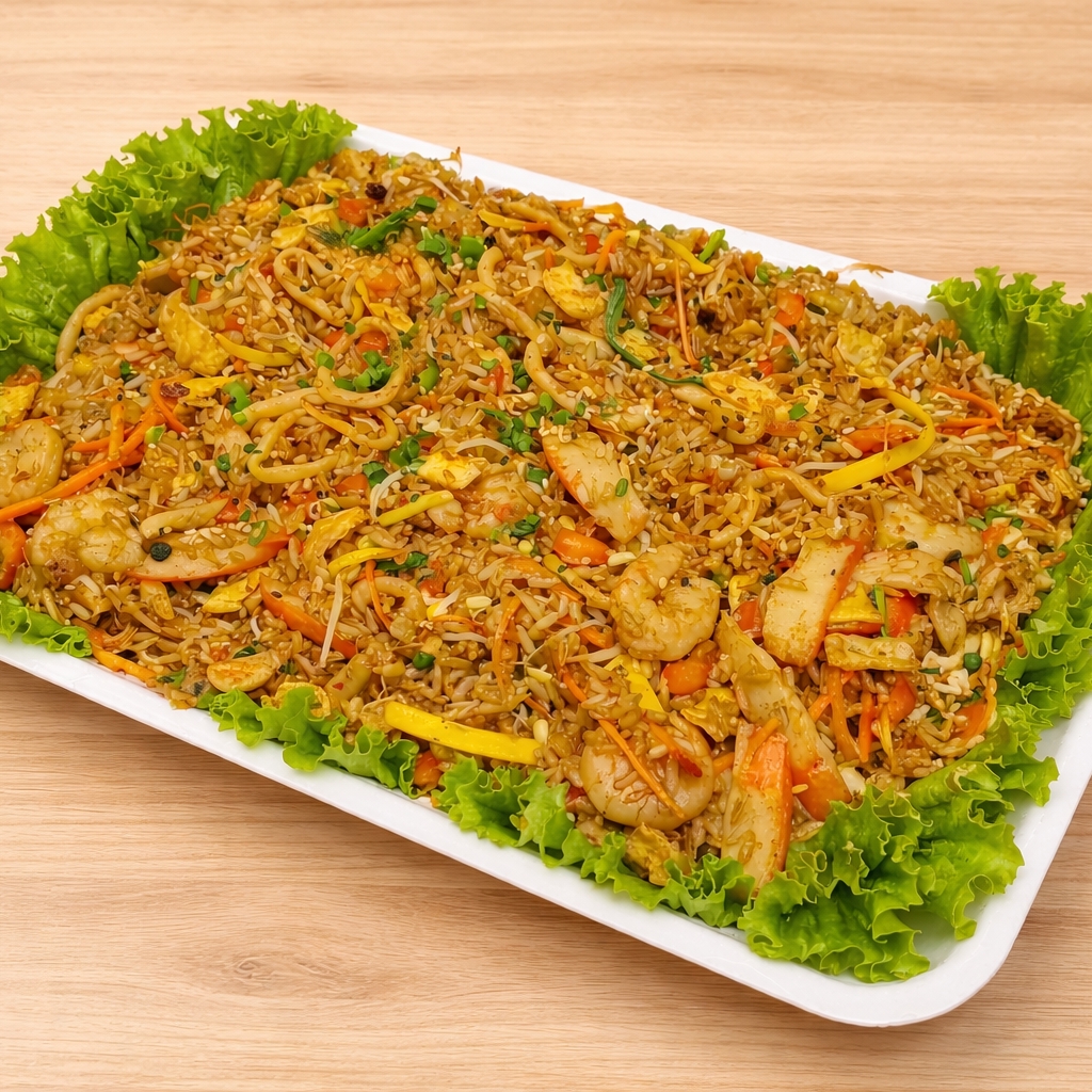Arroz salteado al wok, camarón, calamar, palmito de cangrejo, con vegetales frescos, tortilla de huevo, raíz china.