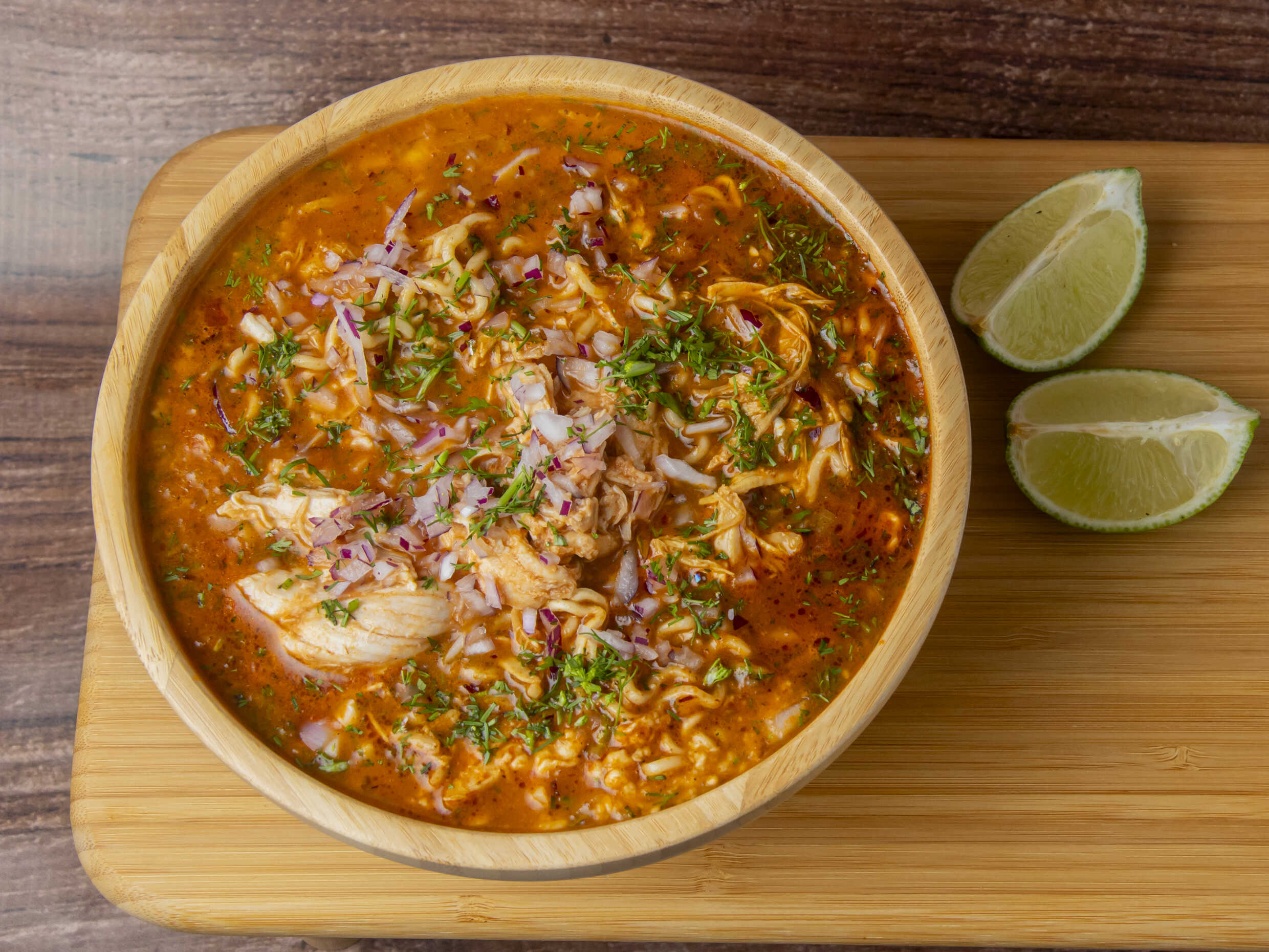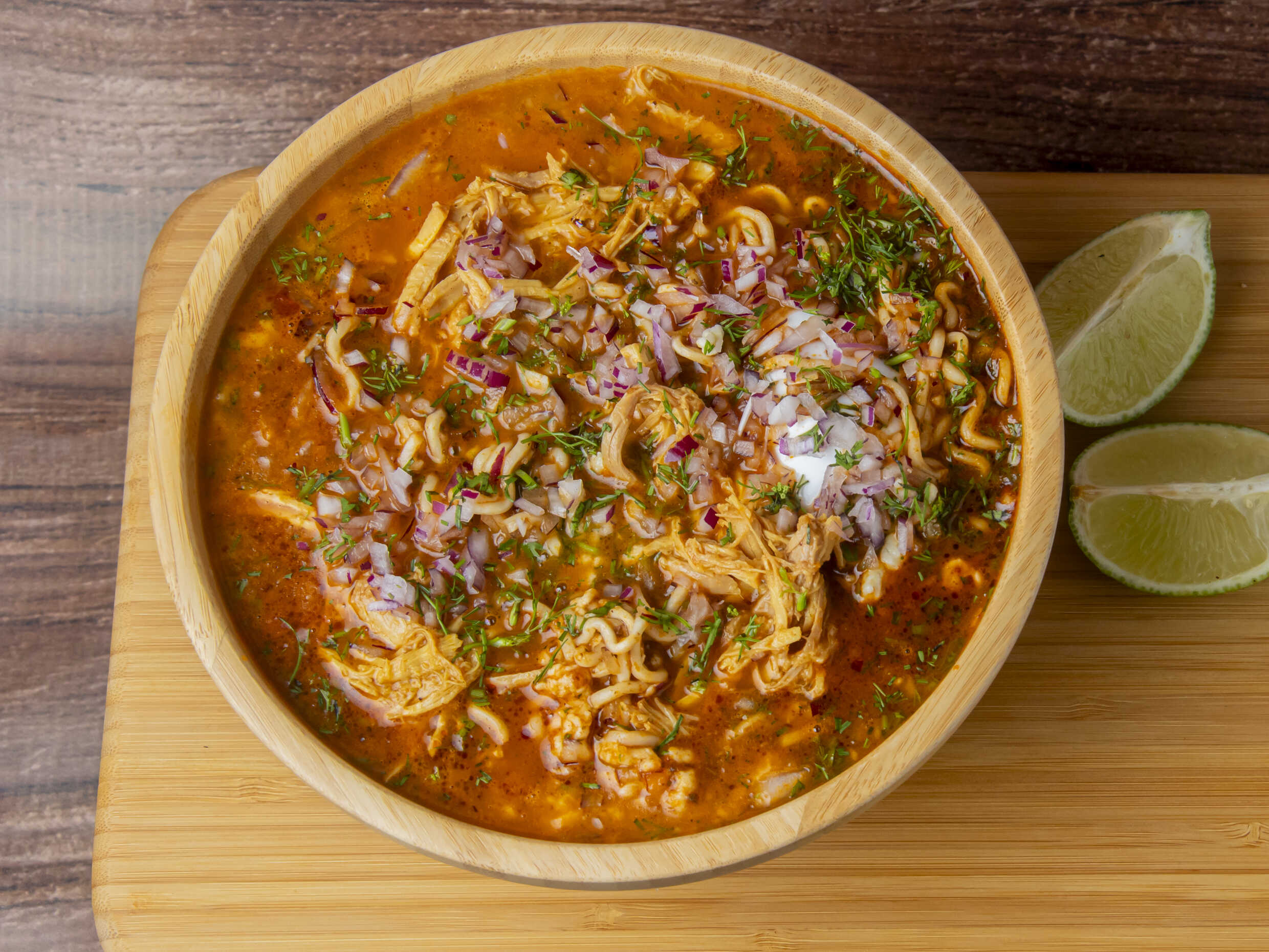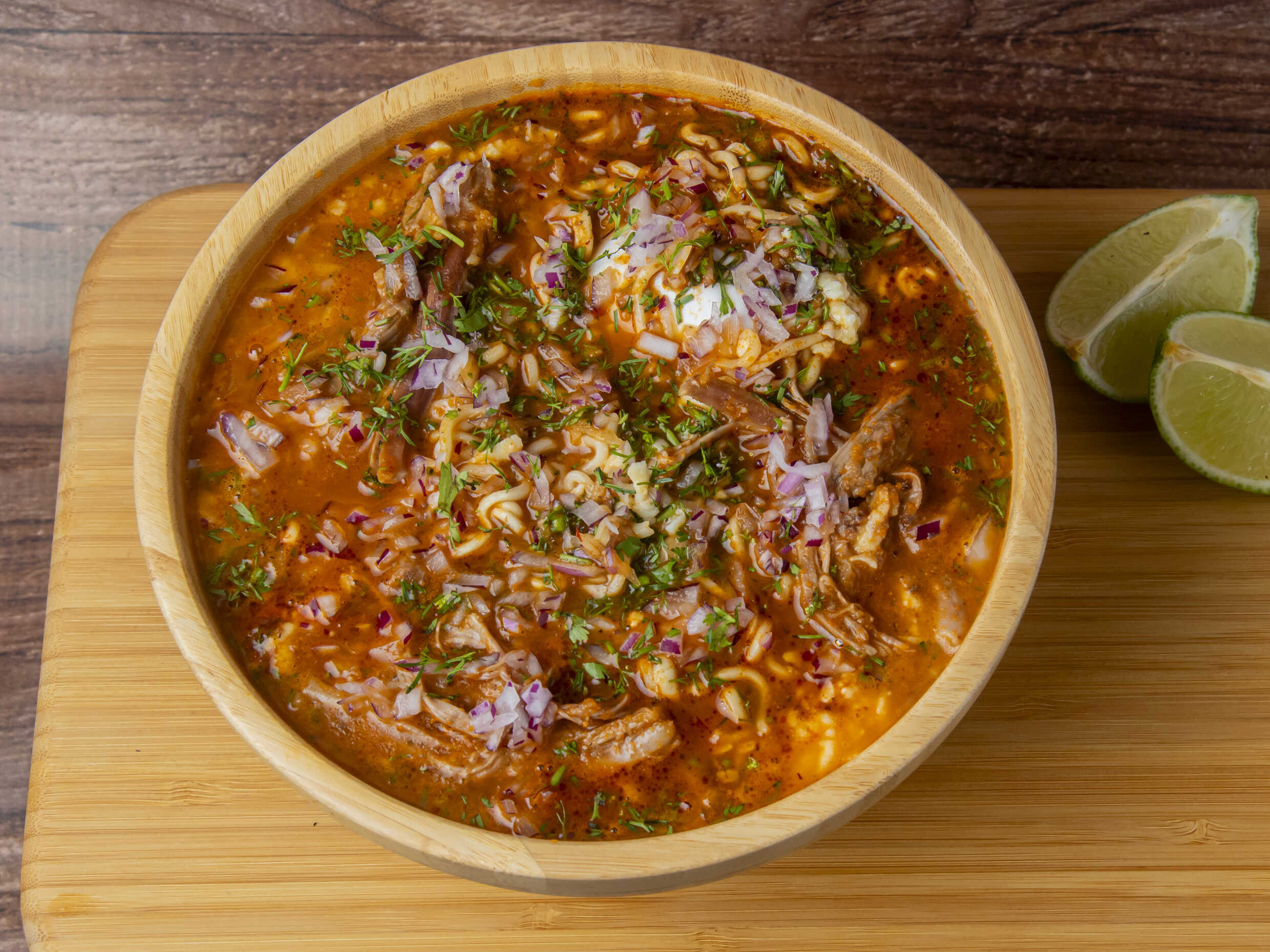 Fideos de huevo en consomé de res y chiles dulces con proteína a elección, cebolla, cilantro , salsa y limones frescos.