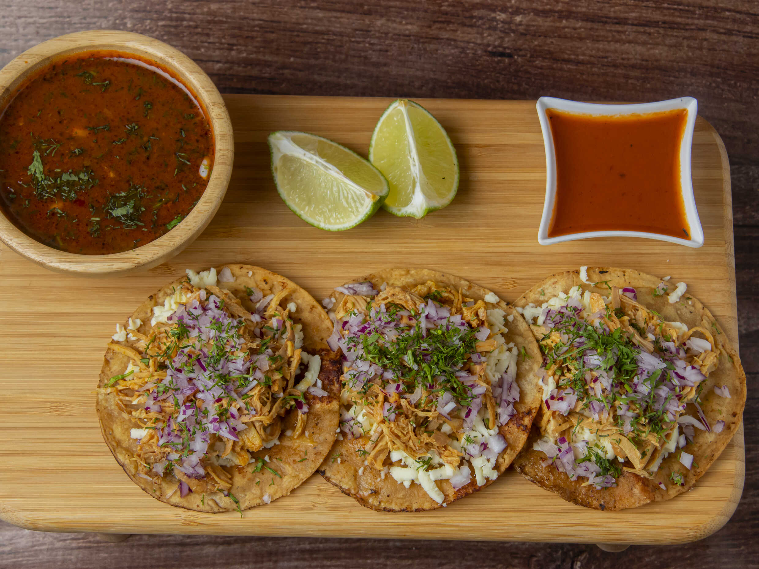 Taco de Tinga de Pollo*3 + Quesuda*1 + Birria Personal*1 + Cebolla*1 + Cilantro*1 + Limón*1