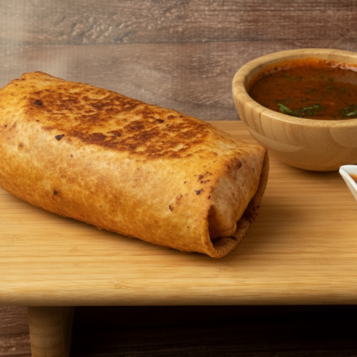 Jugosa potente , cocinada lentamente para lograr un sabor profundo , relleno de arroz de frijol refrito cebolla tomate y res deshebrada acompañada con un consome de birria perfecto para remojar cada bocado
