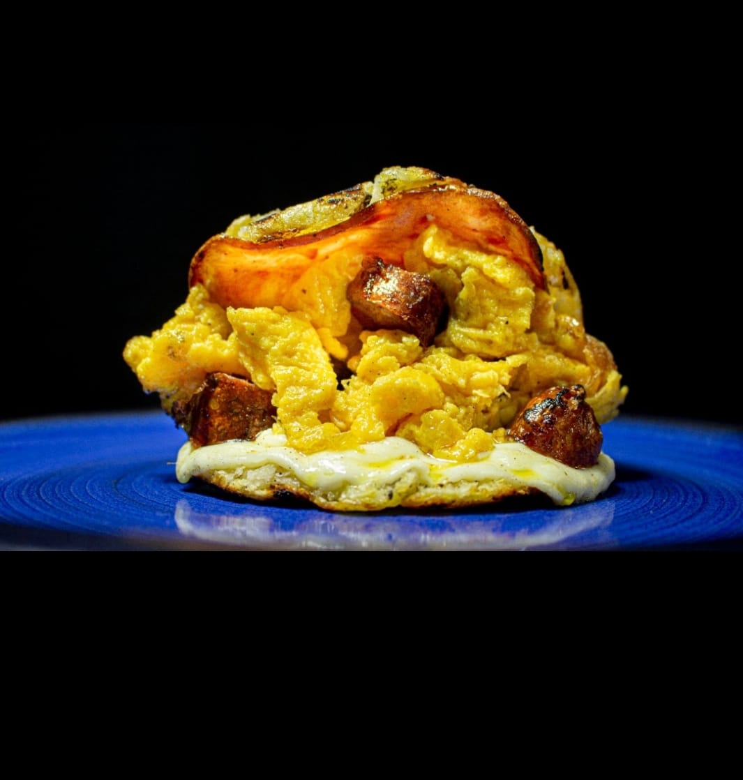Arepa con huevo revuelto, chorizo, queso y jamón.