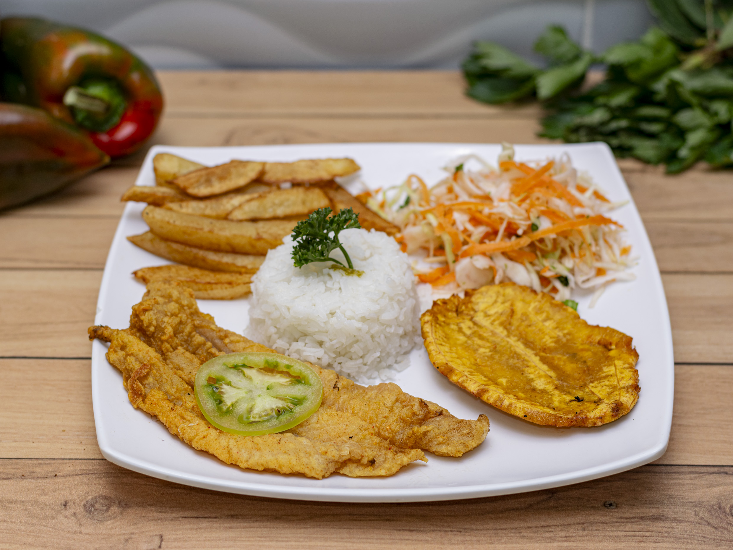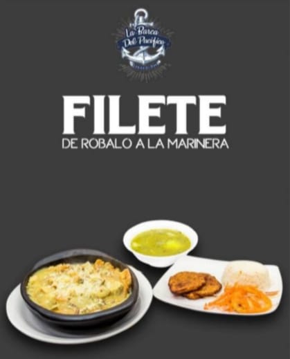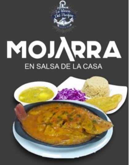 Acompañado de arroz (blanco o coco), ensalada, patacon, papa francesa y sancocho de pescado