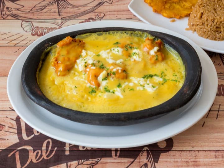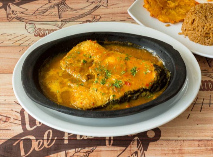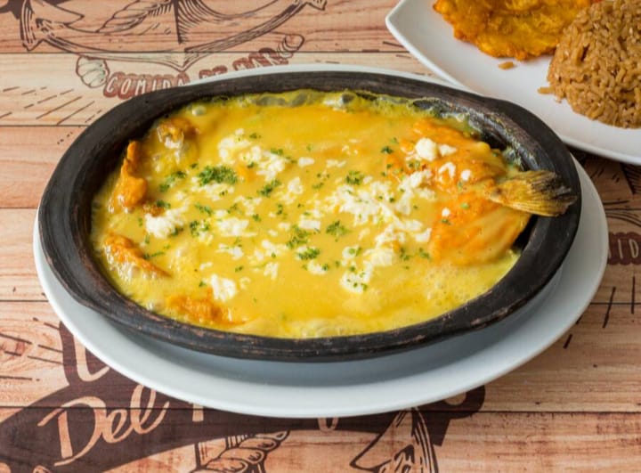 Acompañada de arroz (blanco o coco), patacón, ensalada y sancocho de pescado