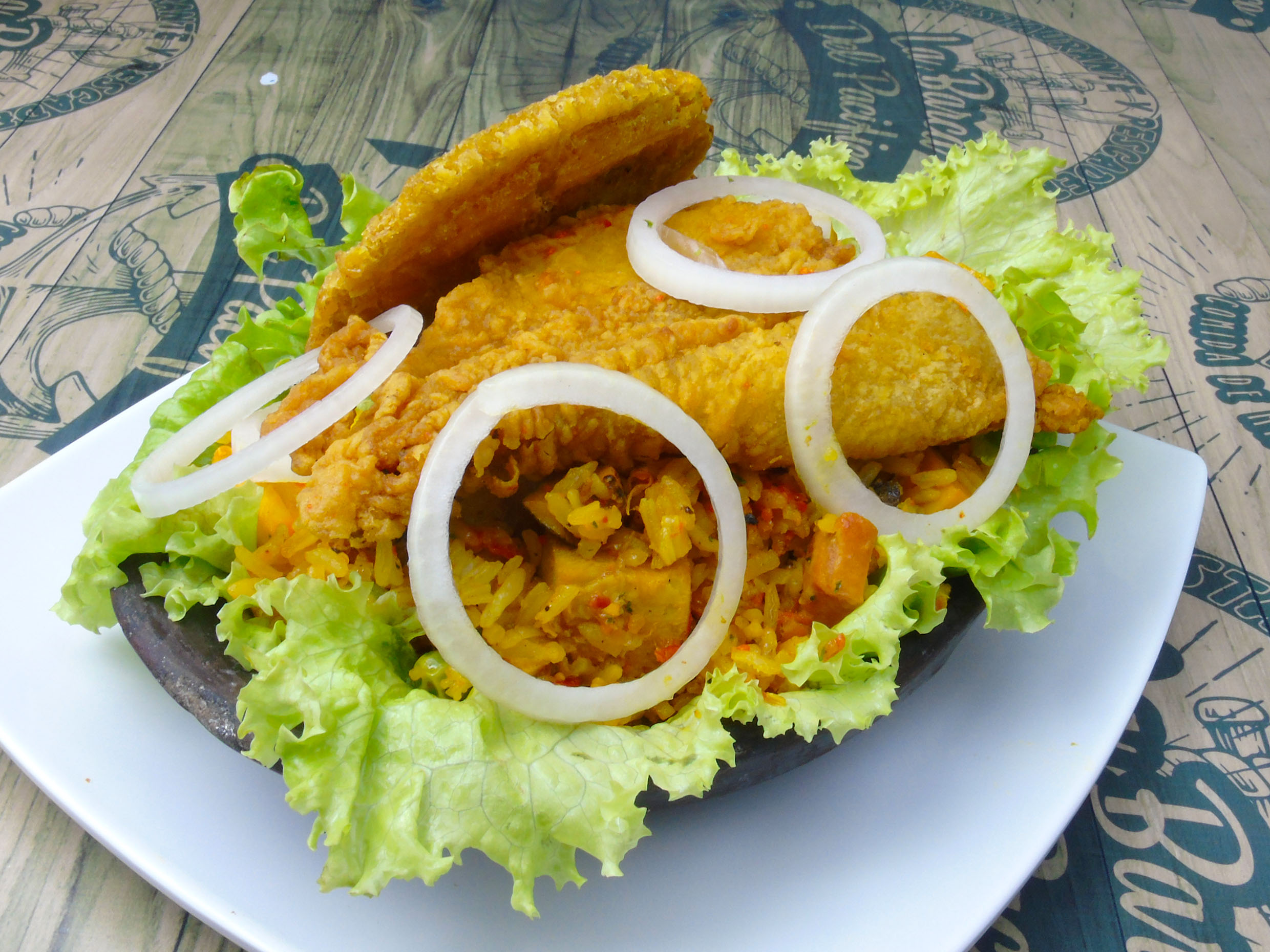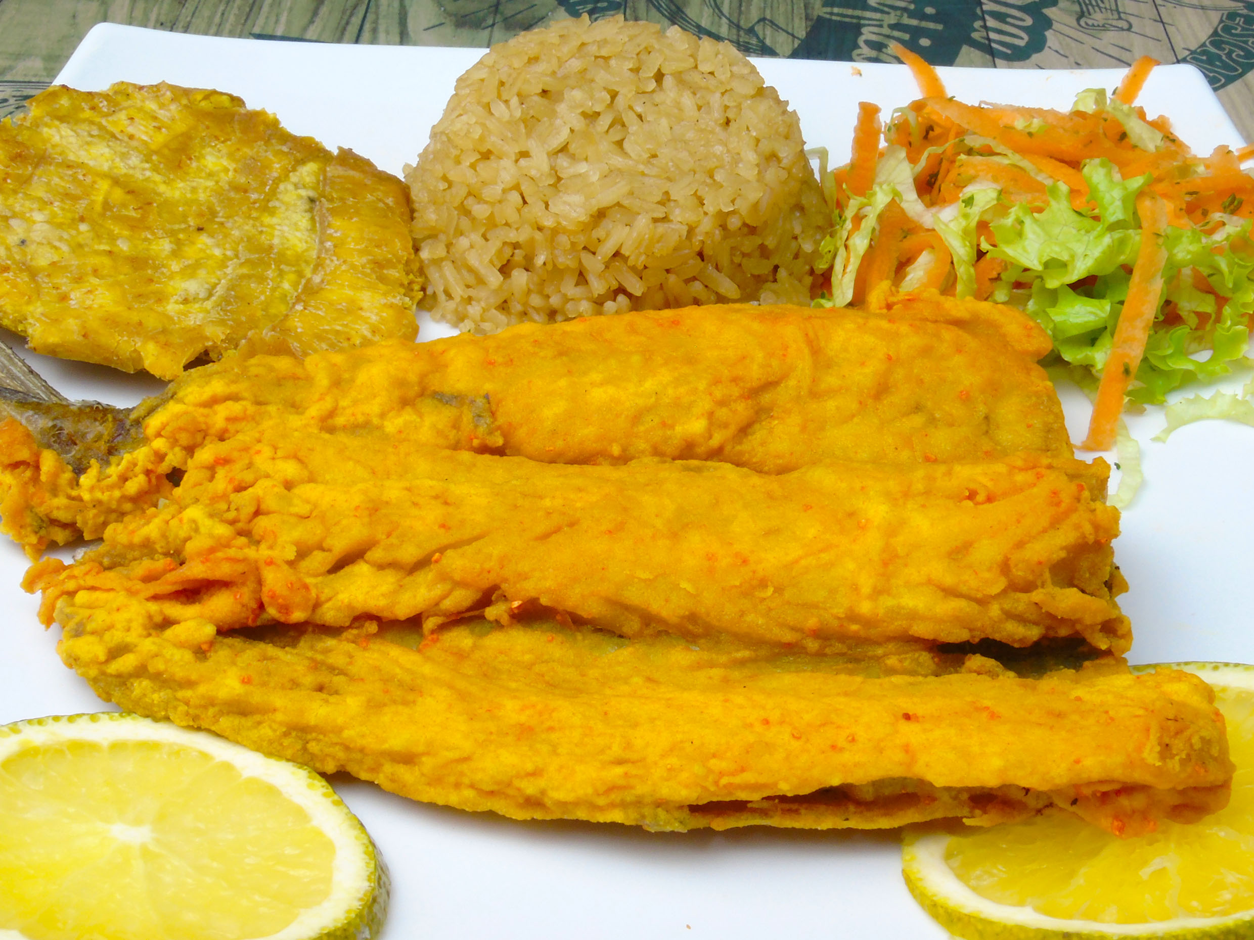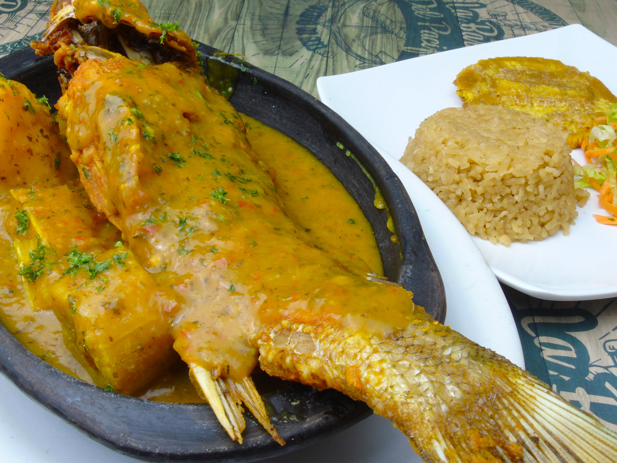 Acompañado de arroz (blanco o coco), ensalada del día , patacón y sancocho de pescado