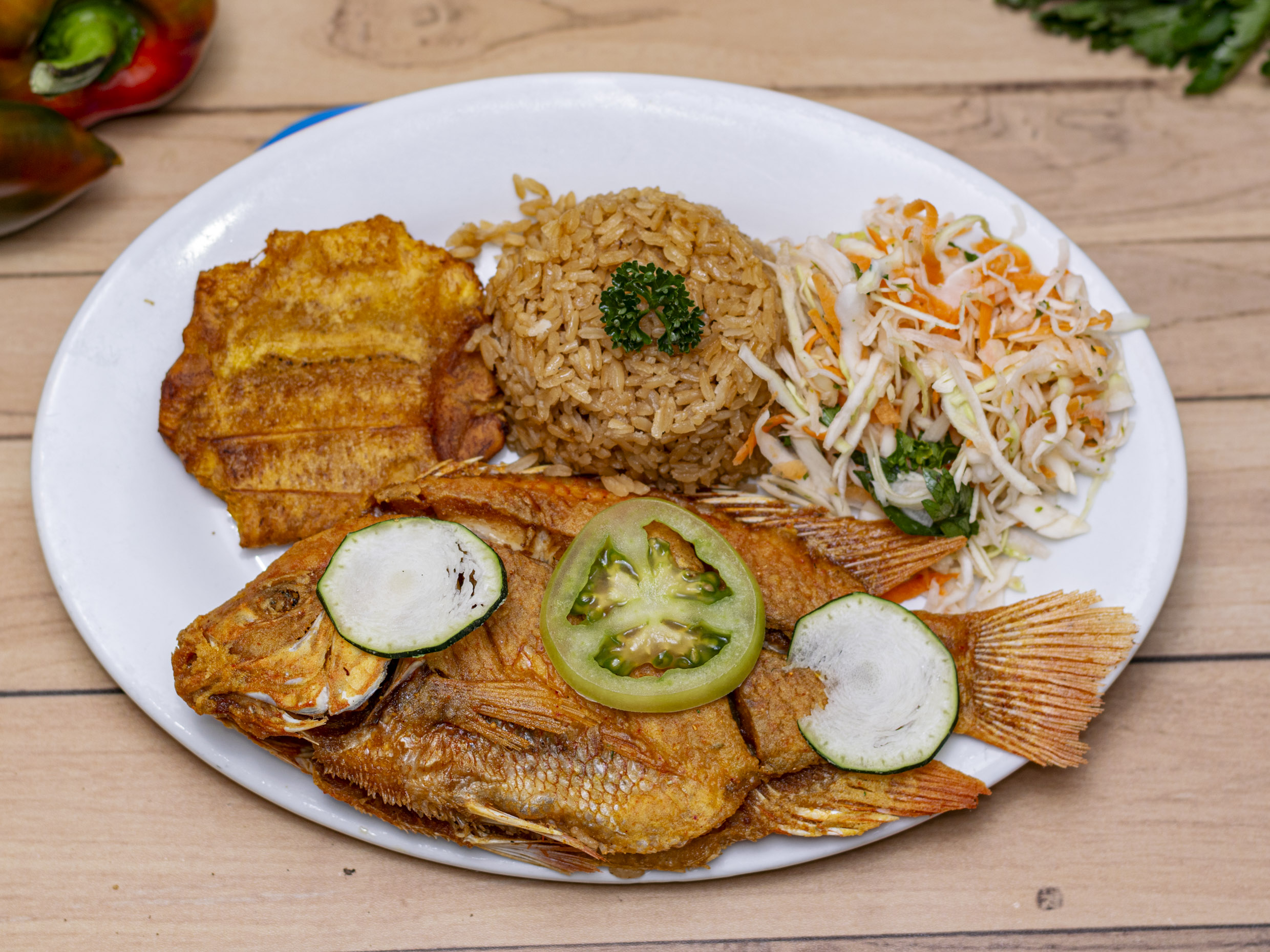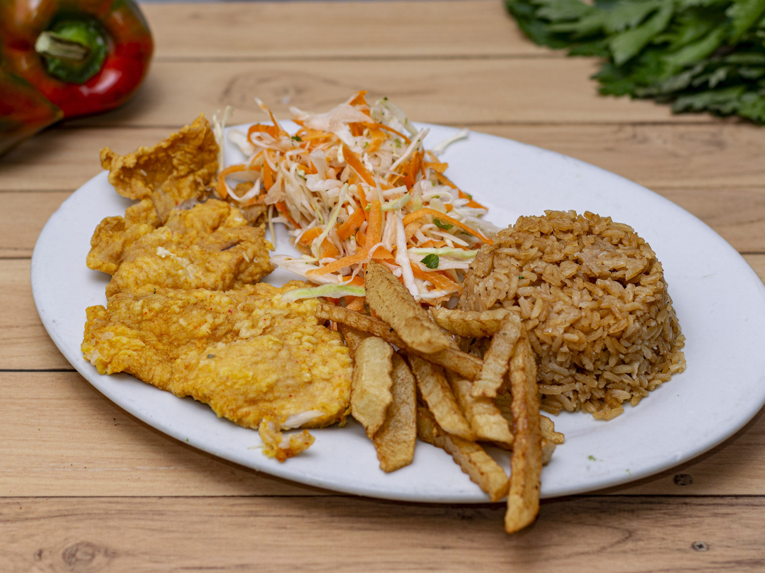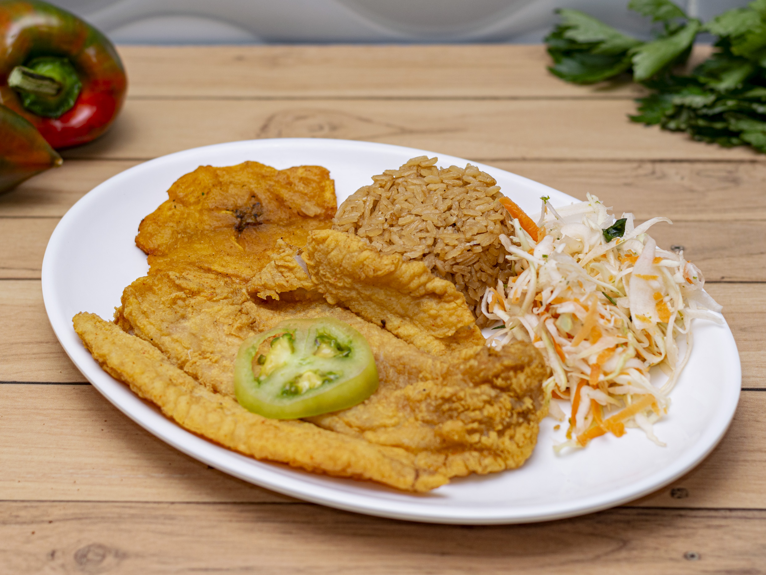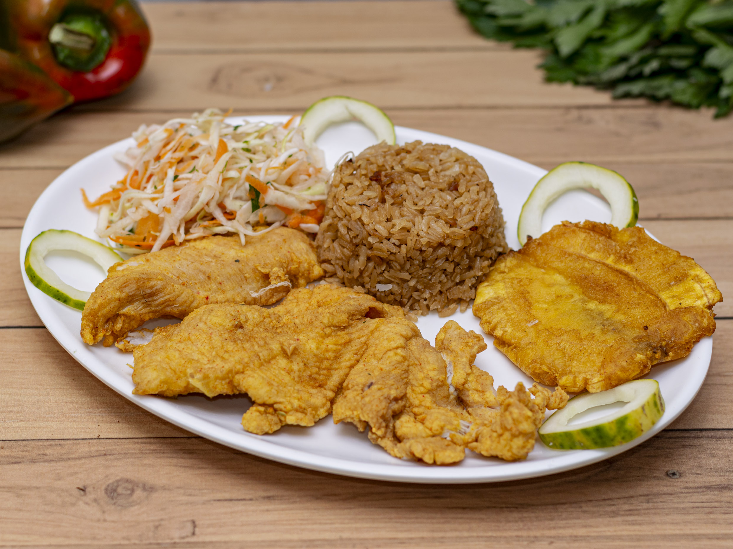 Acompañado de arroz (blanco o coco), ensalada del día , patacón y sancocho de pescado