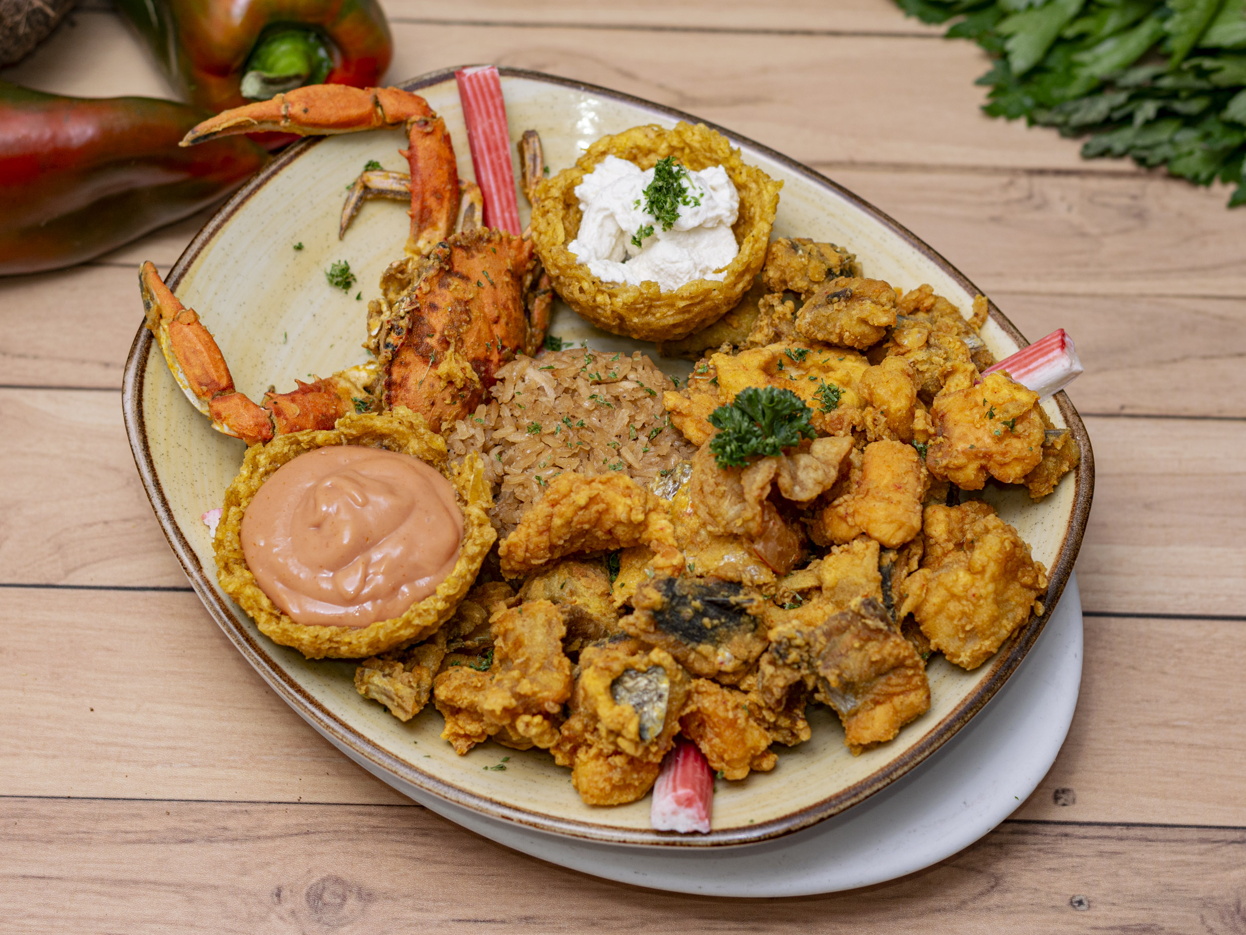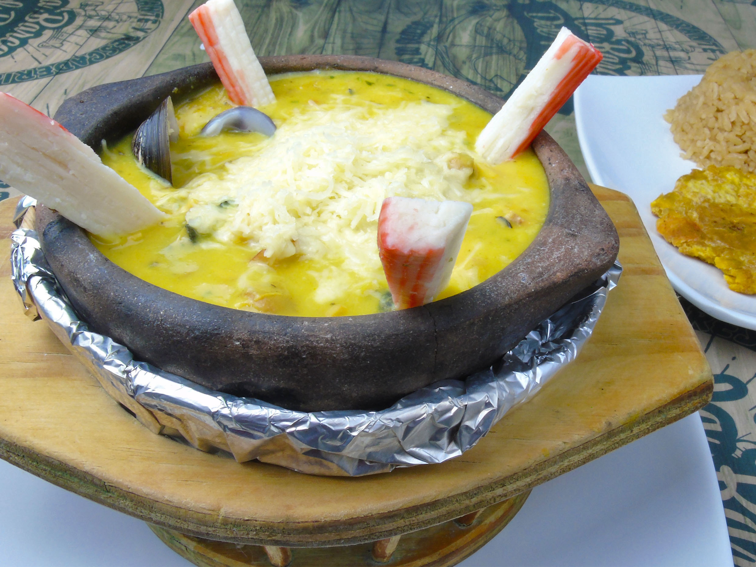 Incluye mariscos, langostinos y cangrejo. Acompañado con arroz (blanco o coco) y patacon